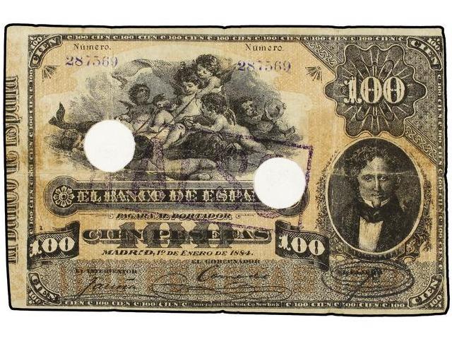 100 Pesetas. (1 Enero 1884). Mendizábal. FALSO de ÉPOCA. Dos taladros. Ed-B68f; LB-68f, mismo ejemplar. MBC.