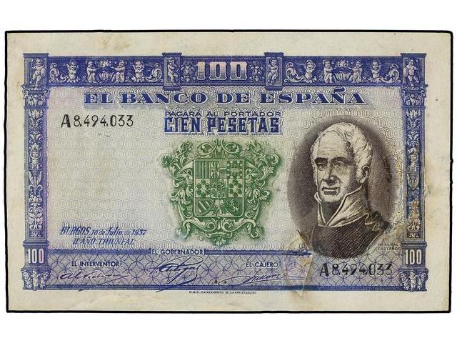 100 Pesetas. 18 Julio 1937. Anv.: General Castaños. Rev.: Batalla de Bailén. Serie A. NO EMITIDO. Marca de aguas: busto del General Castaños a derecha. (Diversas reparaciones). En 1937 se encarga a Coen y Cartevalori de Milán la fabricación