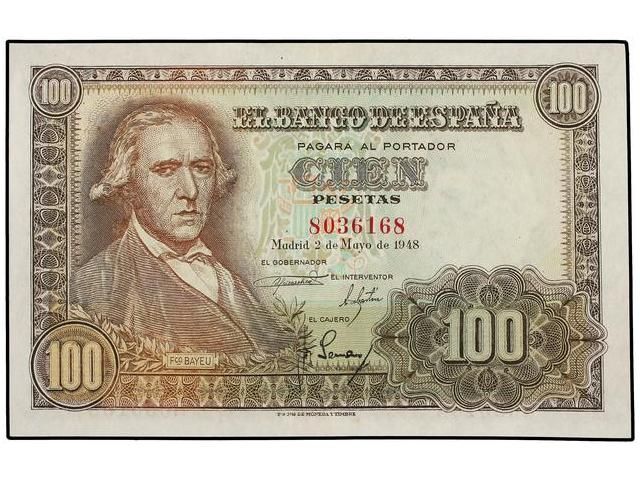 100 Pesetas. 2 Mayo 1948. Bayeu. Sin Serie. Ed-D57a. EBC-.