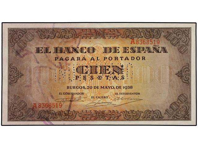 100 Pesetas. 20 Mayo 1938. Casa del Cordón. Serie A. INUTILIZADO en perforación. Ed-D33n; LB-234i. EBC.