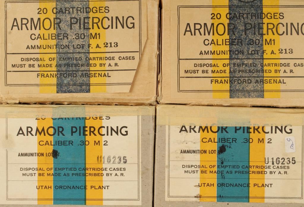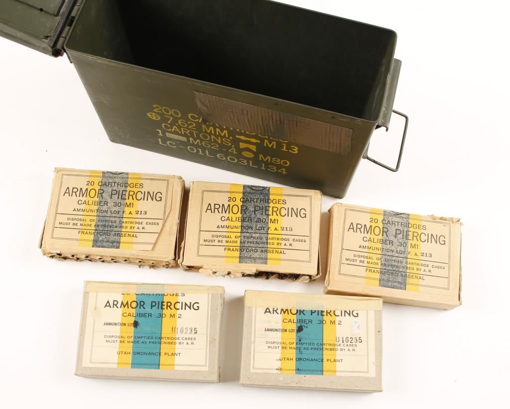 All in 20 round sealed boxes. 60 rounds of Cal. .30 M1 from Frankford Arsenal and 40 rounds of Cal. .30 M2 from Utah Ordnance Plant. All in a 7.62 ammo can.