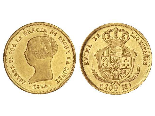 100 Reales. 1854. MADRID. Restos de brillo original. (Ínfimo golpecito en canto y rayita en reverso). ESCASA. Cal-7. EBC.