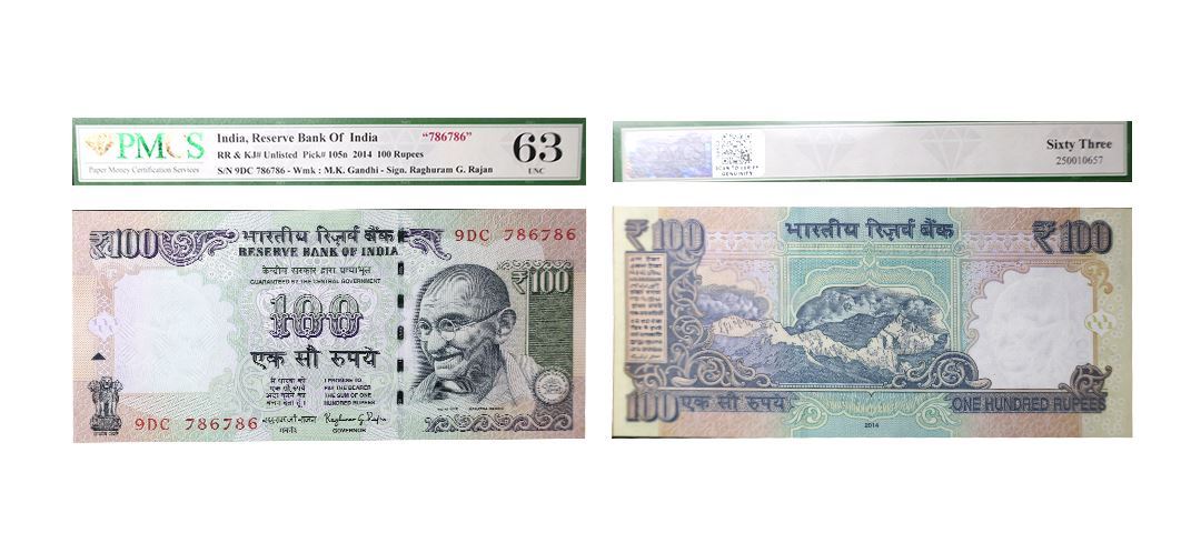 100 Rupees, Fancy Number, 2014, Signed by Raghuram Rajan, Serial No. 9DC 786786, PMCS Graded 63 Uncirculated, Scarce.