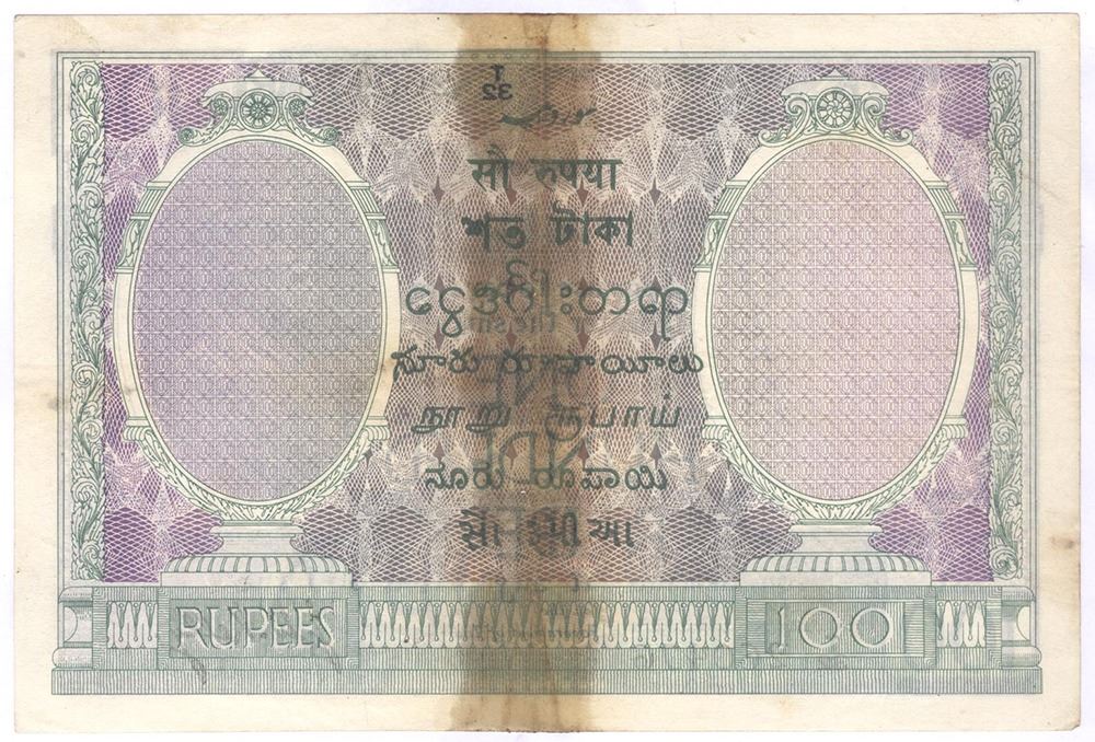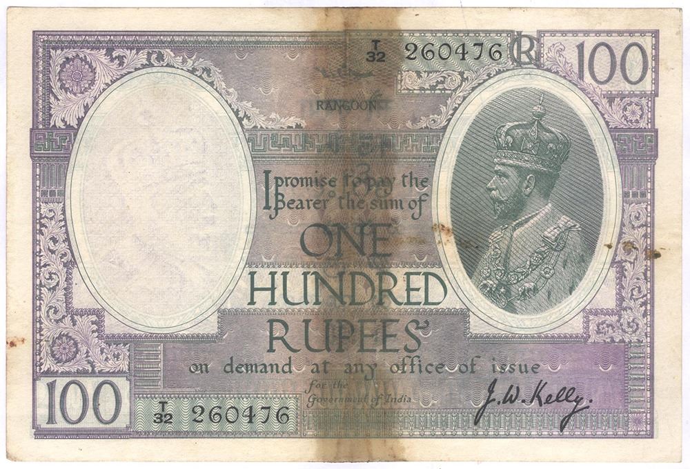 King George V,1930-1931,100 Rupees,Second Issue,Rangoon Circle in Green,signed byJ.W. Kelly, T Prefix, S.No: T32 260476,(KJ RR # 3.10.3 G),pin holes, two folds, center is stained, exceptional white paper, about extremelyfine otherwise, VeryRare.