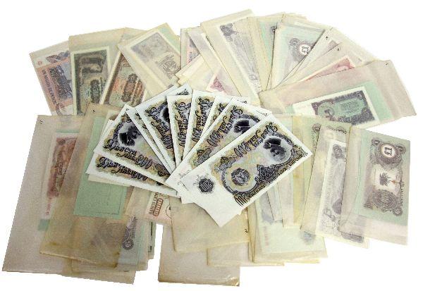 A horde of uncirculated world currency dating pre-war to 1970's. The lot is from a 1970's currency investing club or program. Each envelope containing 1 to 10 pieces of currency and most with a description card. A sampling of the countries represented is: