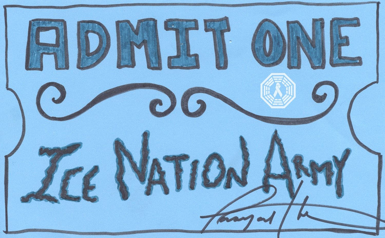 The 100 Writers Room Ice Nation Doodle on a 5 x 8 inch index card. 3 tiny tack holes in top lettering, from being pinned to writers room board. Signed by Tasya Teles. In fine condition. Created, donated and signed on the back by Executive Producer/Writer Aaron Ginsburg.