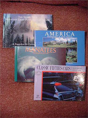 (100) Theme Post Cards in (4) Books - Cars, Manatees, Sierra Club & America Scenes