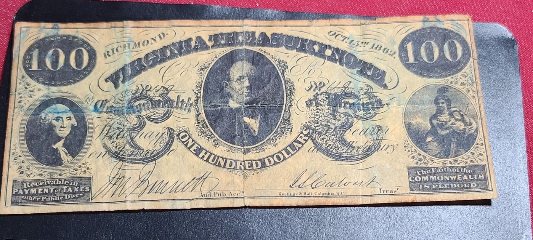 100 VIRGINA TREASURY NOTE OCT 15TH 1862