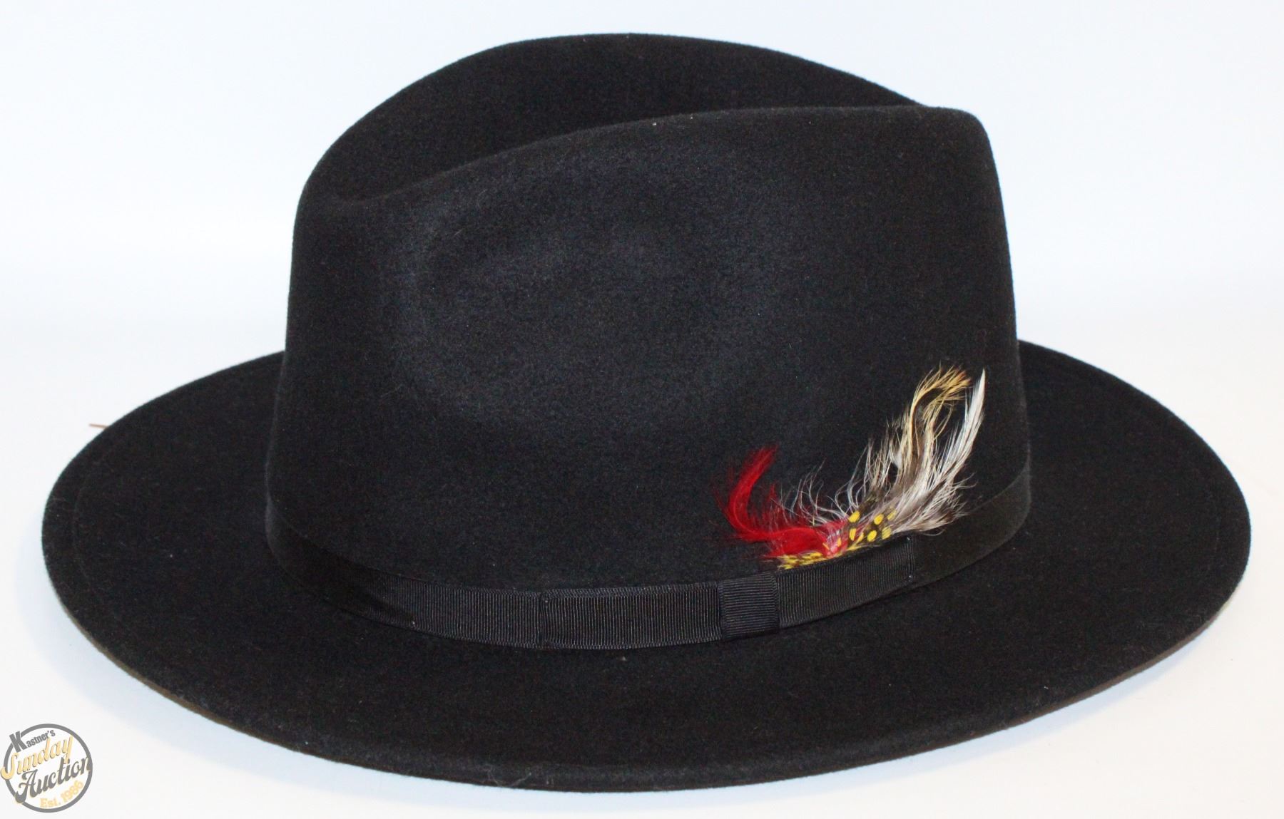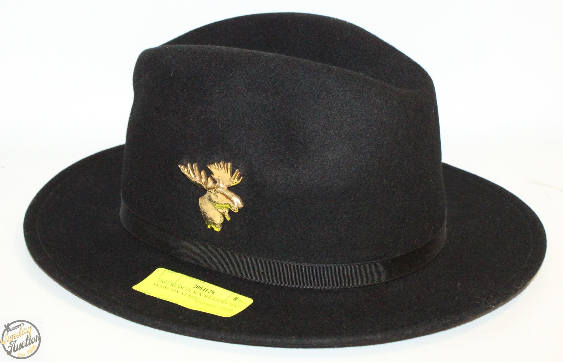 100% WOOL BLACK WESTERN HAT, MOOSE PIN AT SIDE