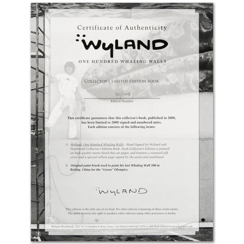 Wyland's exquisite and colorful paintings are expressive, emotive and world-famous. "Wyland: 100 Whaling Walls" (2008) is a deluxe limited edition Collector's Fine Art hardcover book, numbering 344 pages with full color images and text. Comes in a special Collector's Gift Box with one of the actual paint brushes Wyland used to create his 2008 Whaling Wall in Beijing, China for the "Green" Olympics! This commemorative book is numbered out of only 2008, and features a vellum front page that is numbered and hand signed by Wyland! With Introduction by Dr. Robert Payne. Includes Certificate of Authenticity! Measures approx. 14" (width) x 9" (height) x 1.5" (thick).