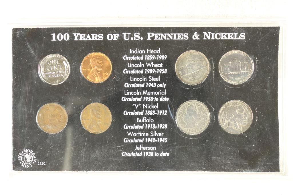 INDIAN HEAD CENT, 3 LINCOLN CENTS, LIBERTY "V" NICKEL, BUFFALO NICKEL, 35% SILVER JEFFERSON WAR NICKEL AND JEFFERSON NICKEL IN PLASTIC CASE