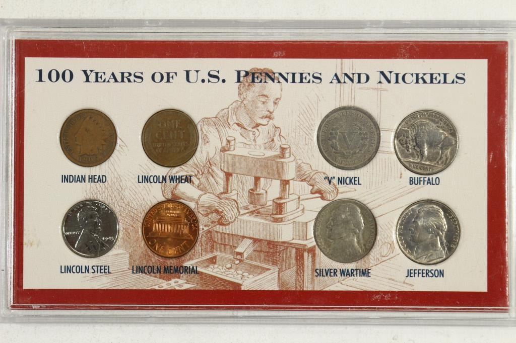 CONTAINS: INDIAN HEAD CENT, LINCOLN WHEAT CENT, LINCOLN STEEL WAR CENT, LINCOLN MEMORIAL, LIBERTY "V" NICKEL, BUFFALO NICKEL, 35% SILVER JEFFERSON WAR NICKEL AND JEFFERSON NICKEL