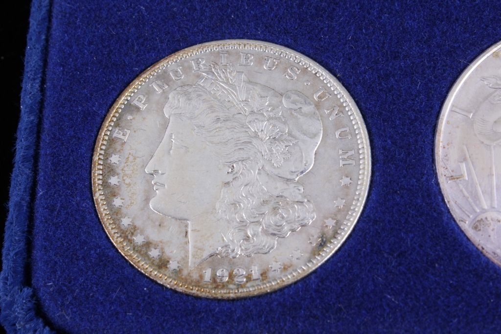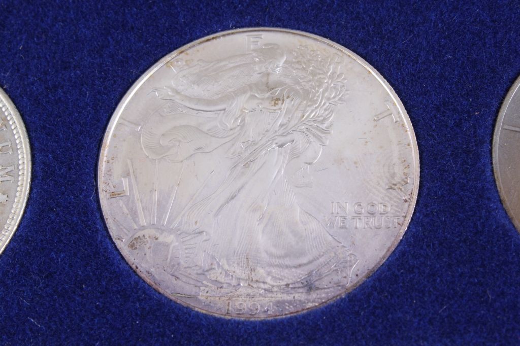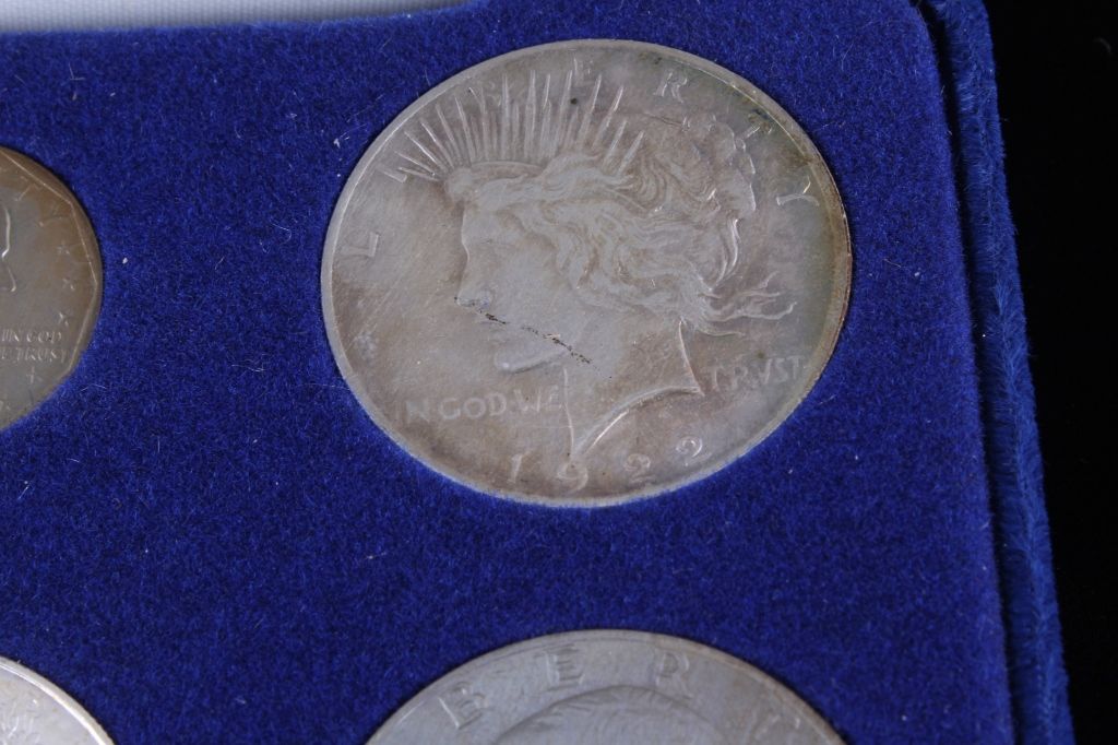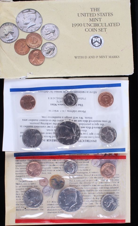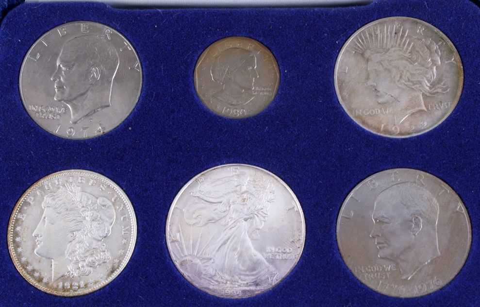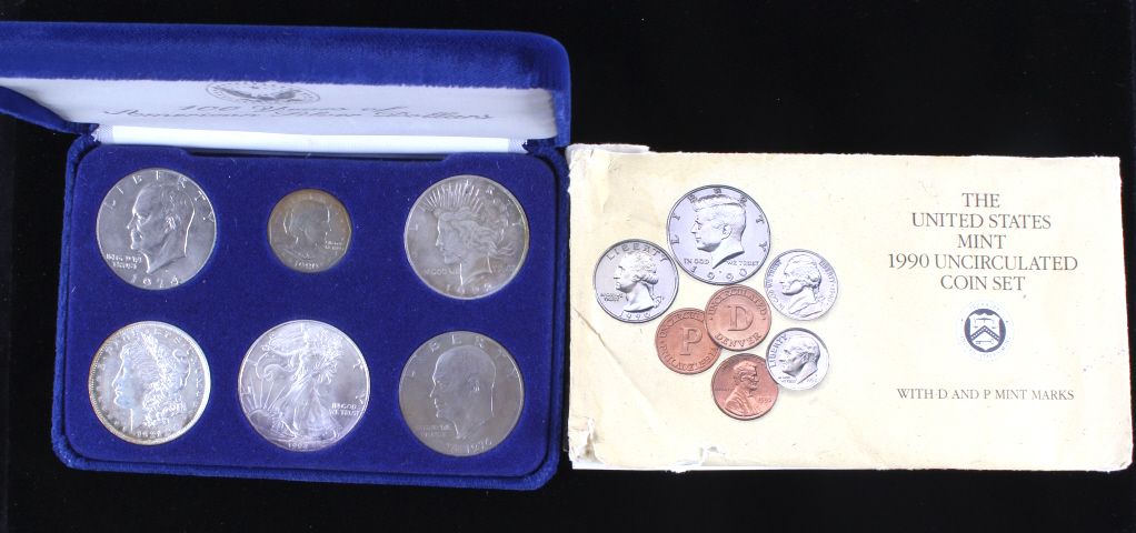 This includes: 1921 Morgan Silver Dollar, 1922 Liberty Peace Silver Dollar, 1994 Silver Eagle 1 oz Fine Silver-One Dollar, Eisenhower 1974 $1, Eisenhower 1776-1976 $1, 1980 Susan B Anthony One Dollar Coin (above from the 100 Years of American Silver Dollars). Also included in the lot is the United States Mint 1990 Uncirculated Coin Set. The set includes both the Philadelphia and Denver mints with such coins as: Lincoln Penny, Roosevelt Dime, Jefferson Nickel, Washington Quarter, Kennedy Half Dollar, and uncirculated mint set coin. All sells together.