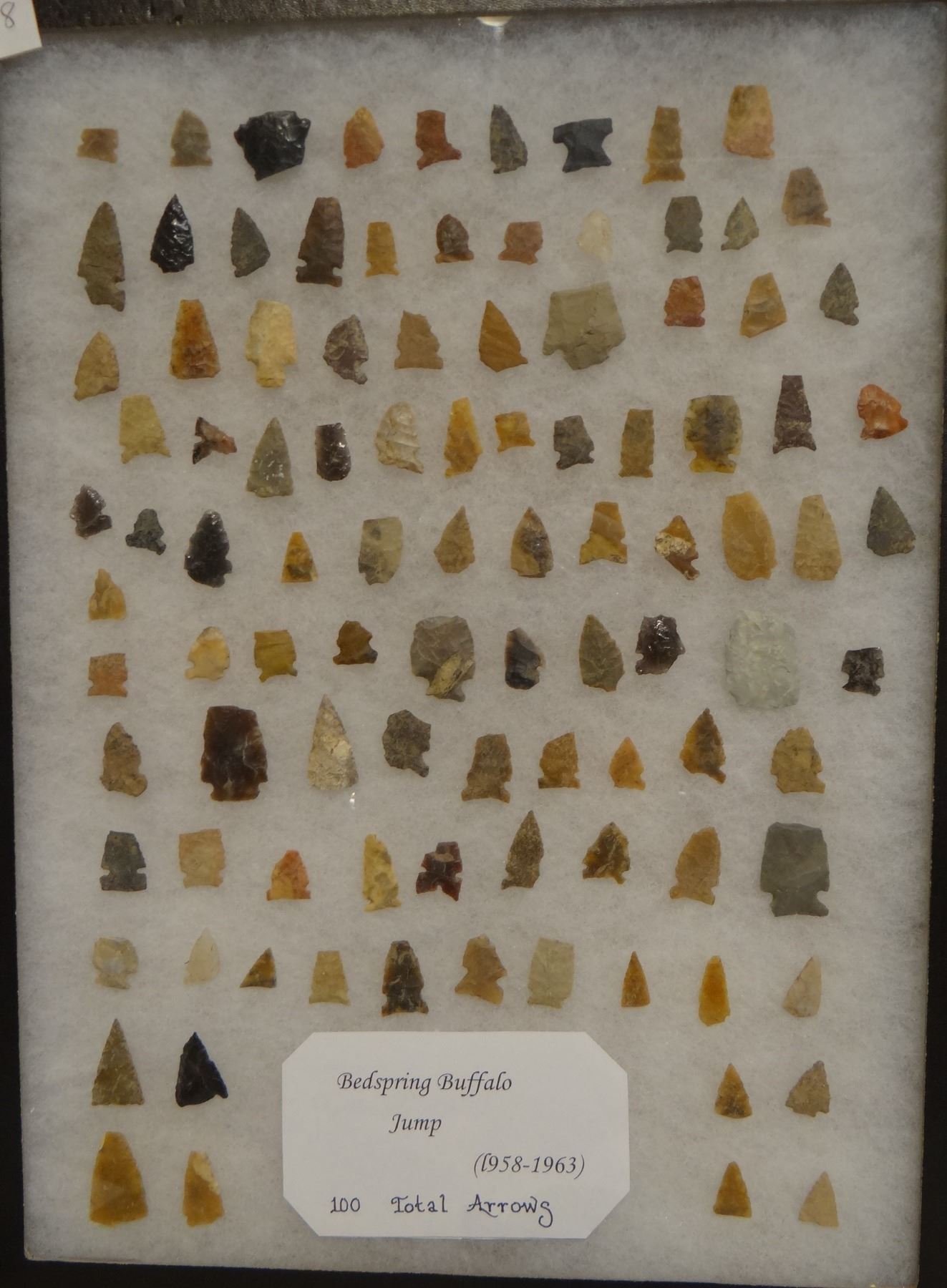 100 arrowheads found 1958-1963, Bed Springs Buffalo Jump, Sun River, MT, in 12" x 16" x 1" frame.