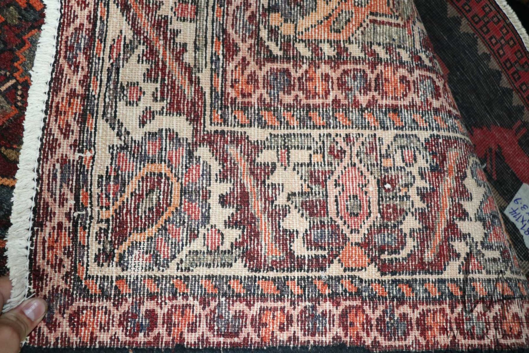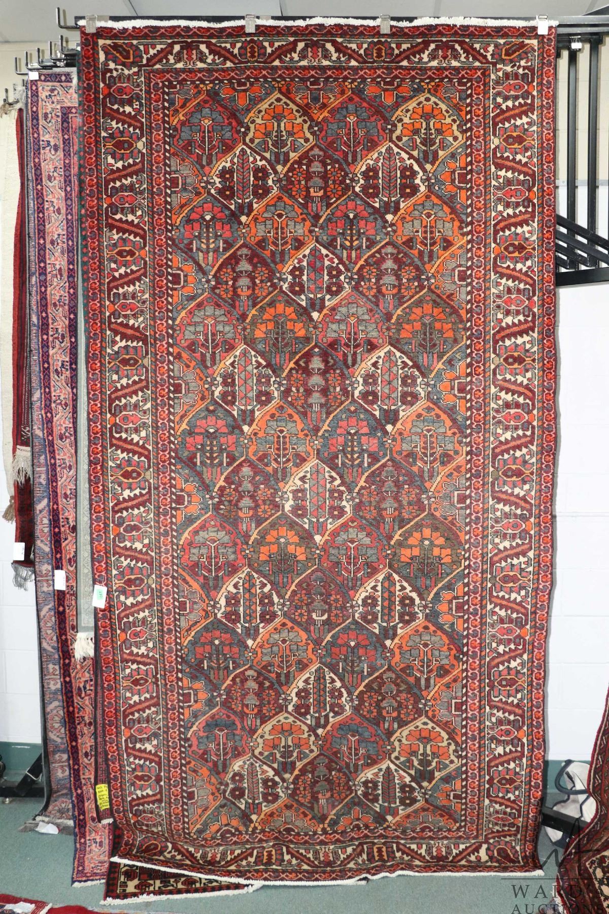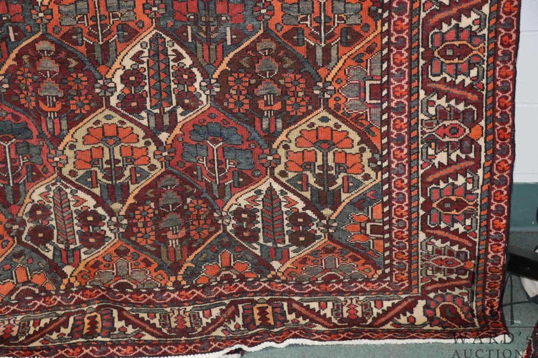 100% hand made Iranian carpet "Baktahyr" with geometric tile design in colours of greys, orange, red etc. 62" X 118". Note: Not available for shipping. Local pickup only