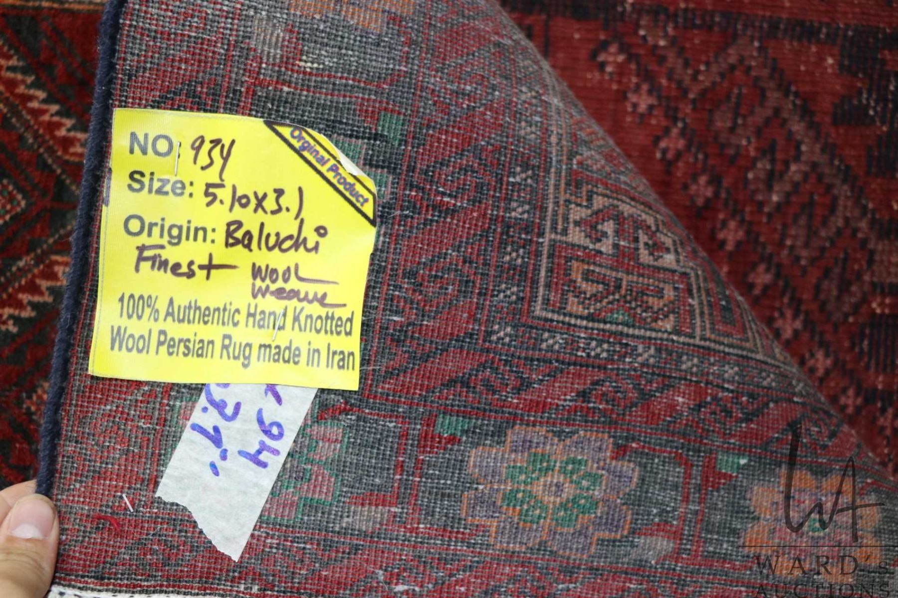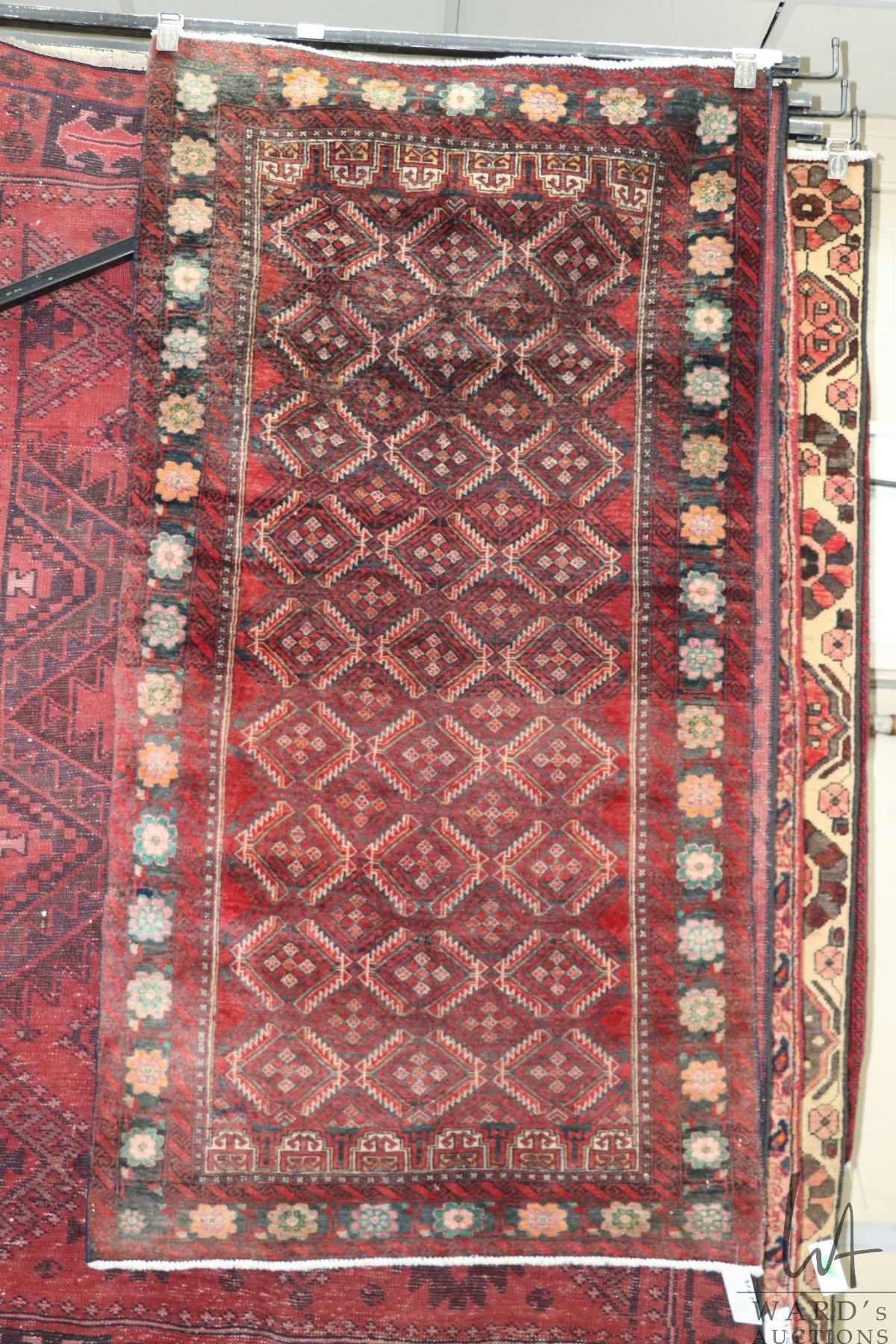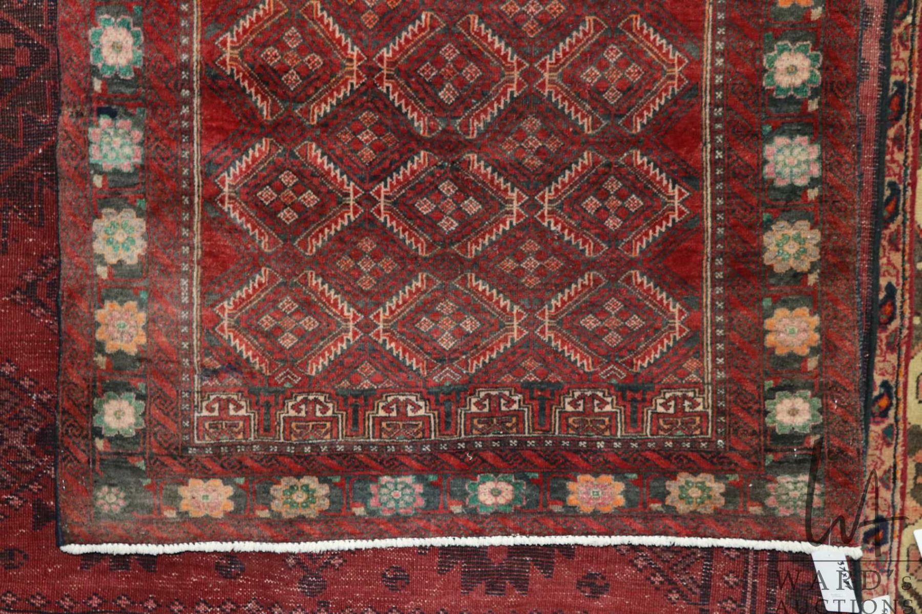 100% hand made Iranian carpet "Baluchi" with overall geometric design, red background and highlights of green, orange and cream etc. 37" X 71"
