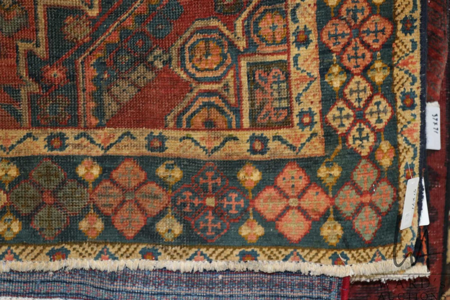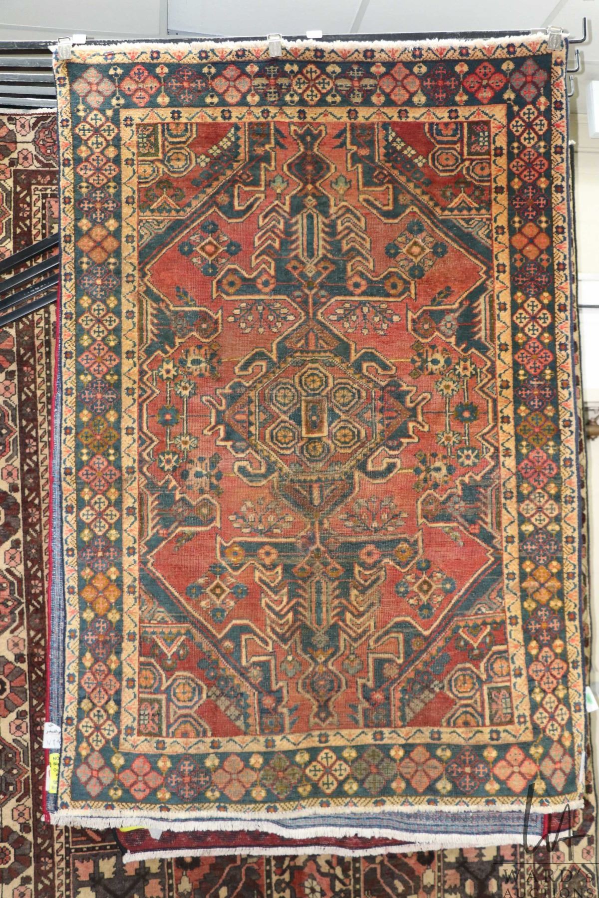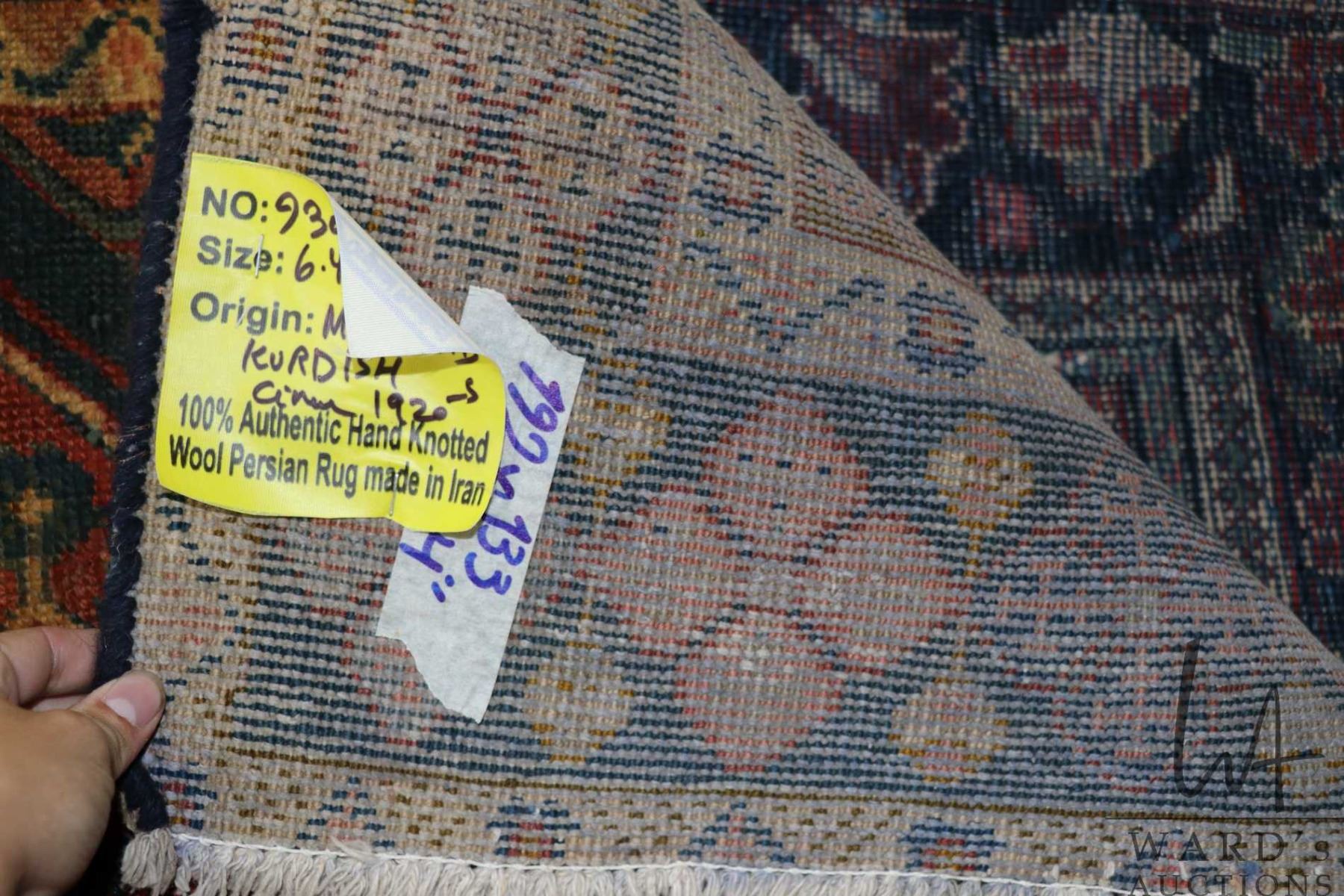 100% hand made Iranian carpet "Mahabad" with center medallion, red background and highlights of blues, burnt orange etc. 51" X 71"