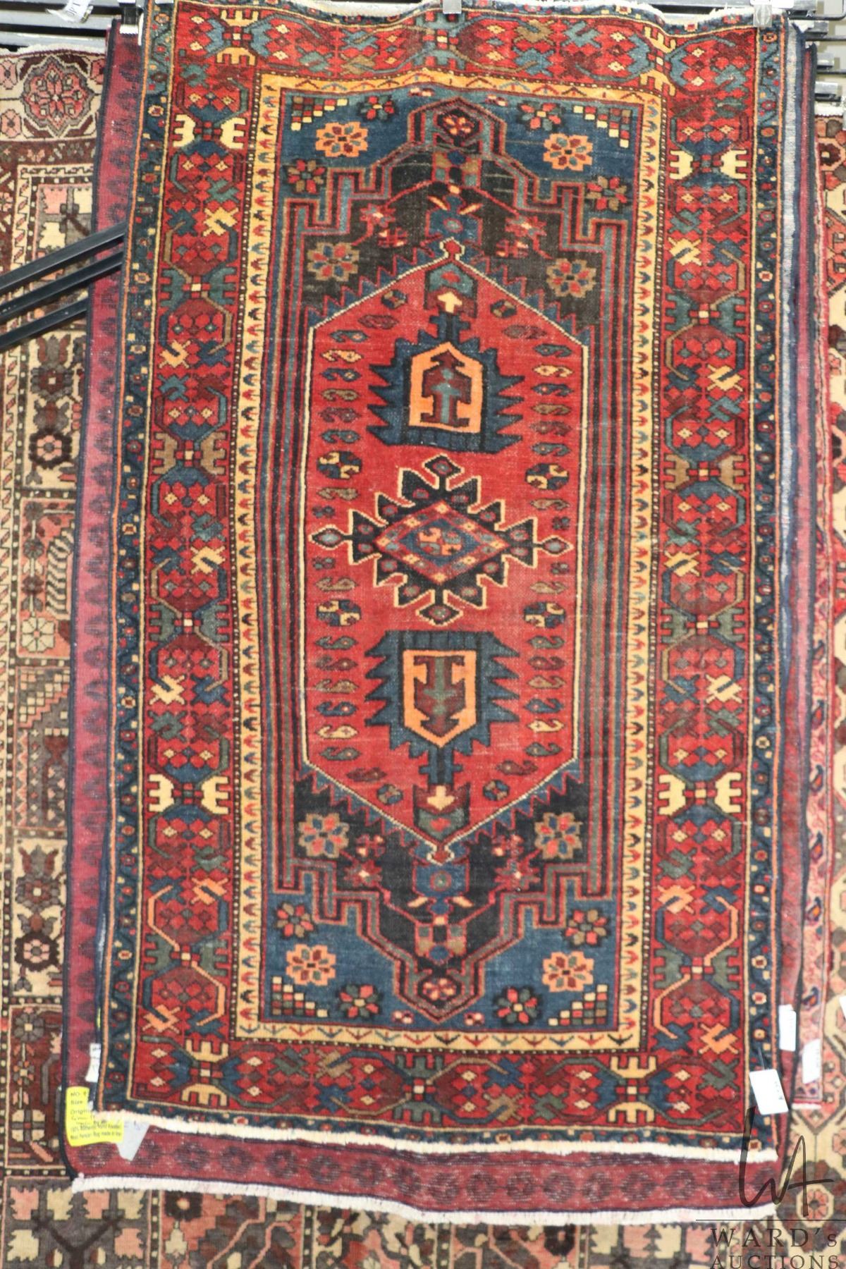 100% hand made Iranian carpet "Zanjan" with red background, center medallion and highlights of blue, orange, green etc. 45" X 78"