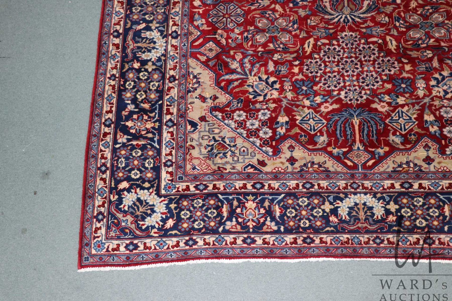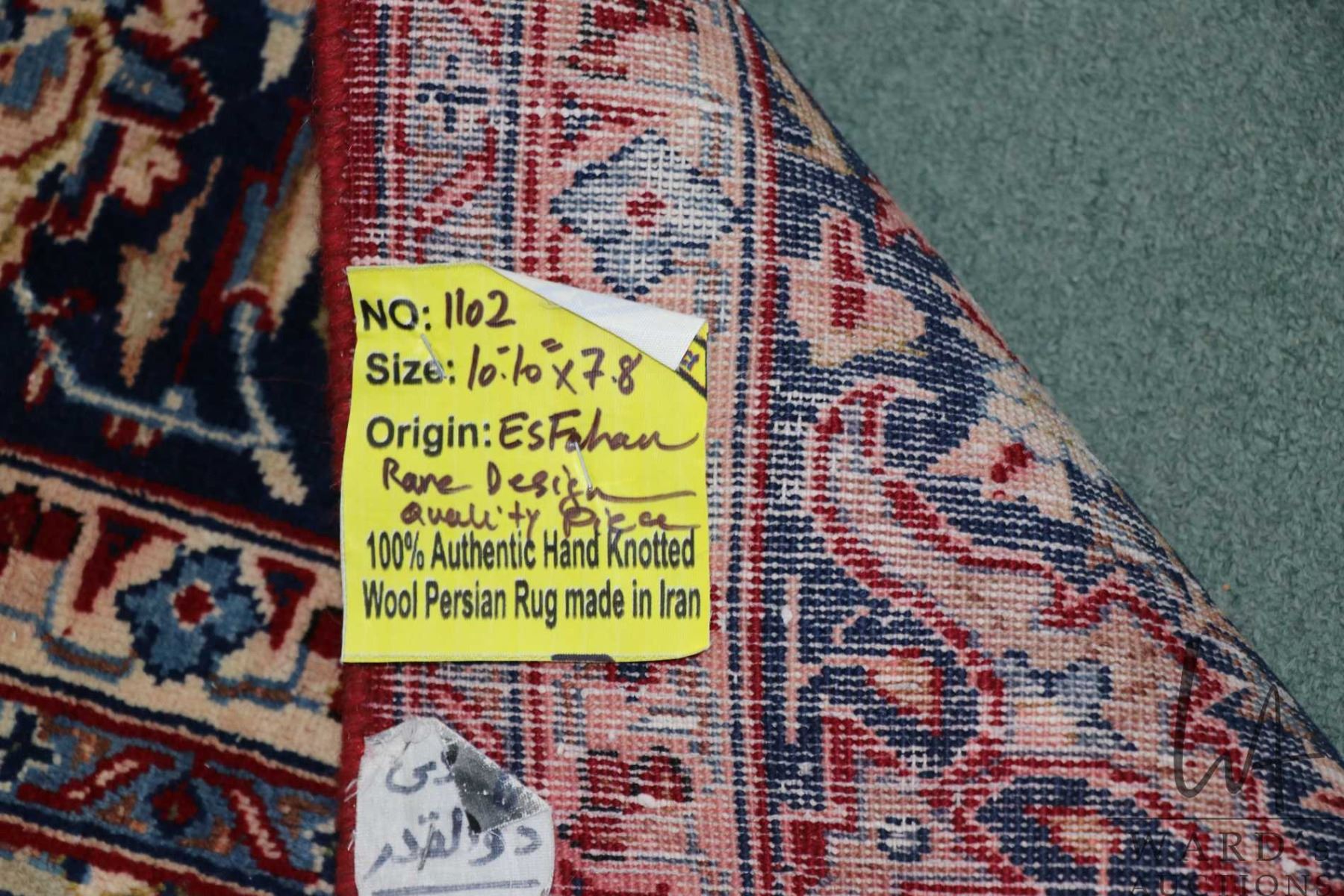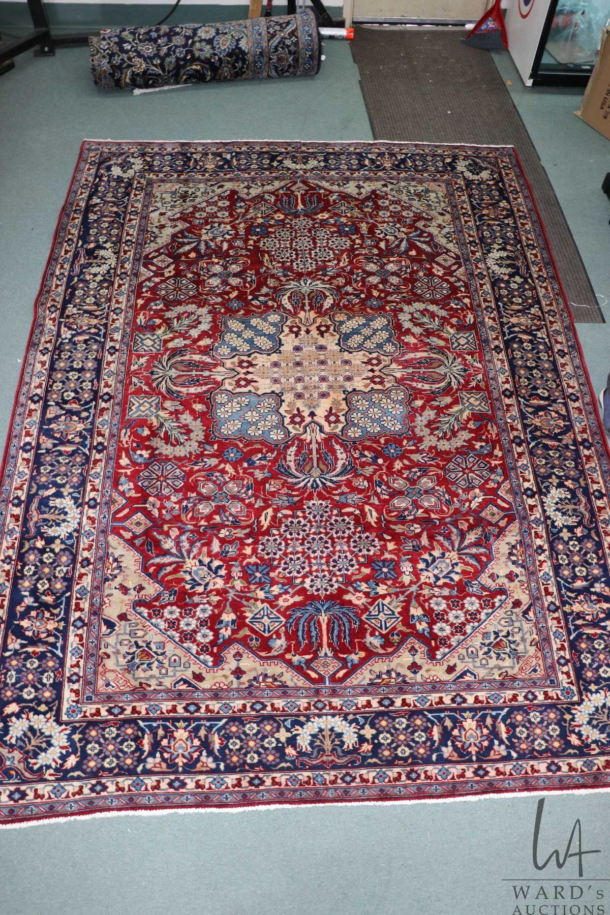 100% hand made Iranian wool carpet, Esfahan, center medallion, red background and highlights of blue, cream etc. 89" x 130". Note: Not available for shipping. Local pickup only