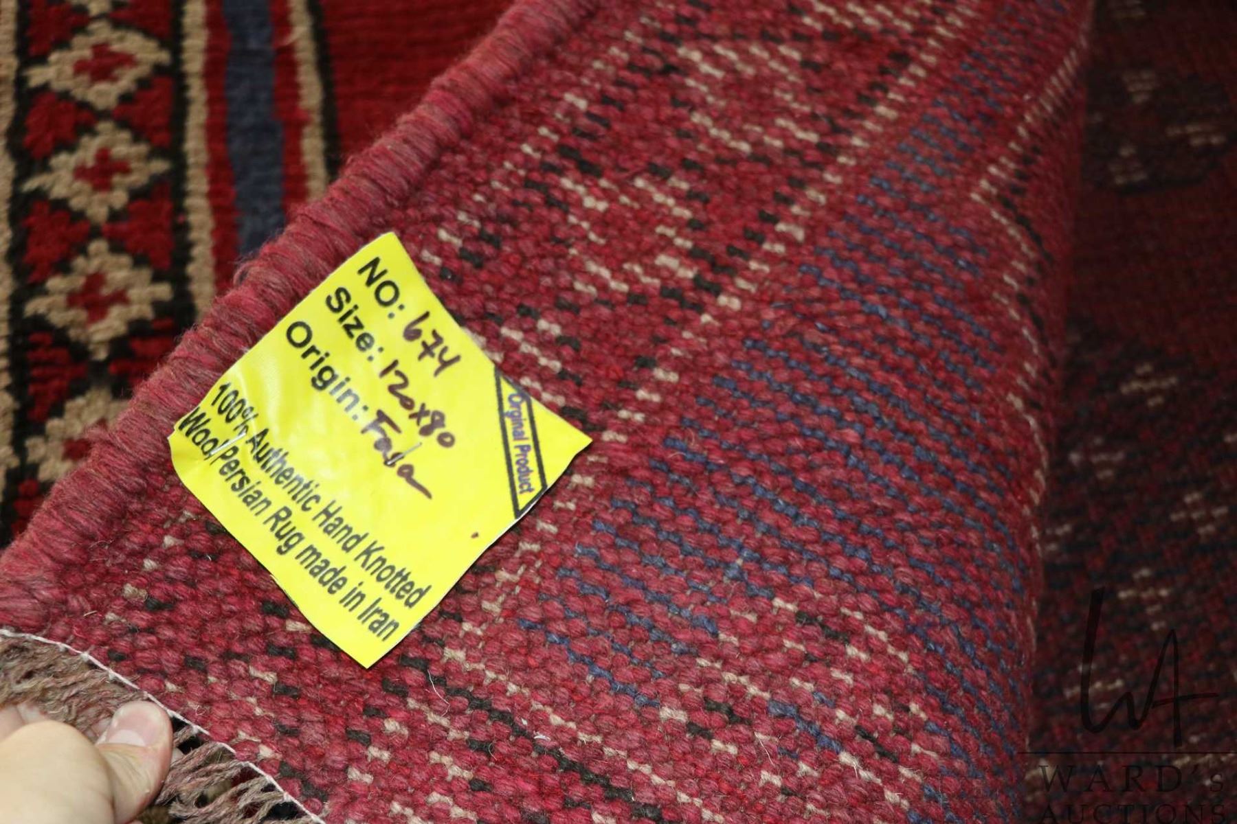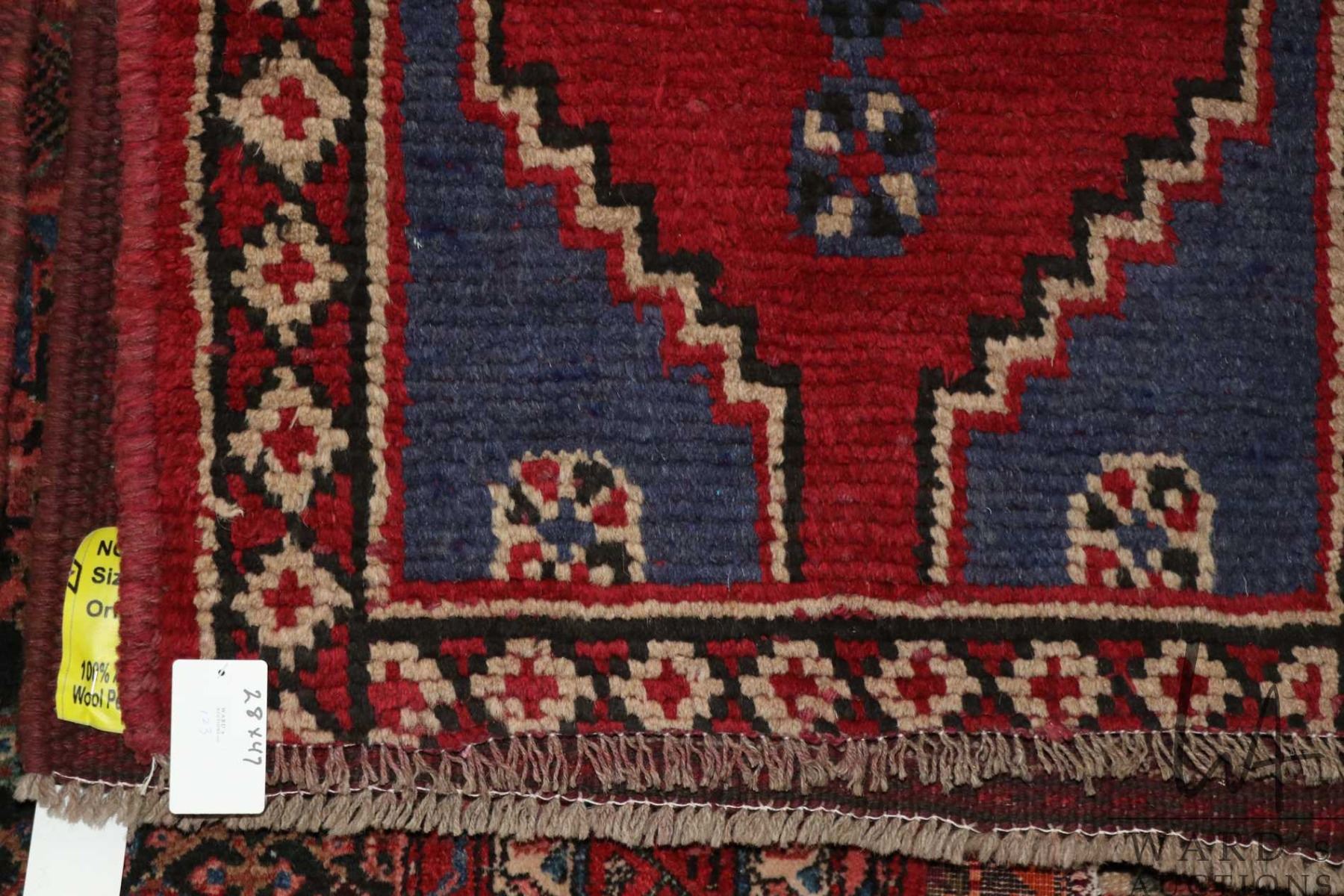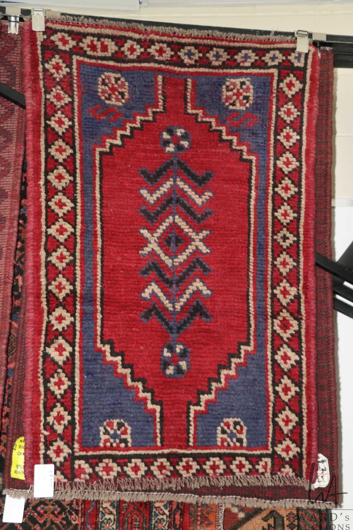 100% hand made Iranian wool carpet, Fasa, red background and highlights of blue, cream, black etc. 28" x 47"