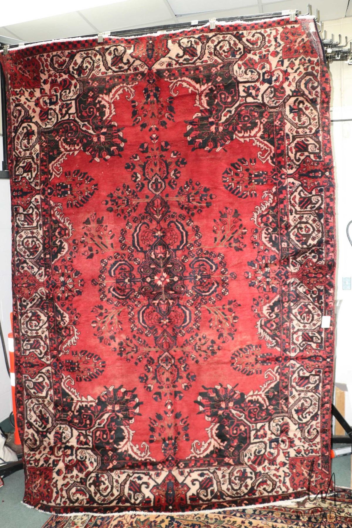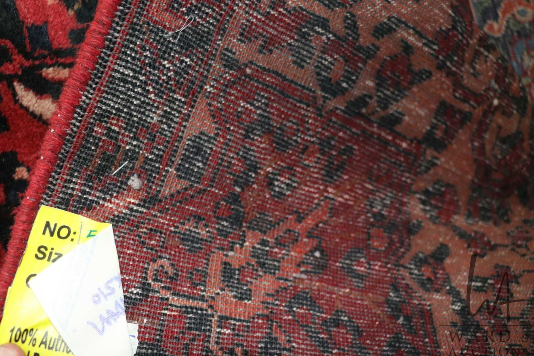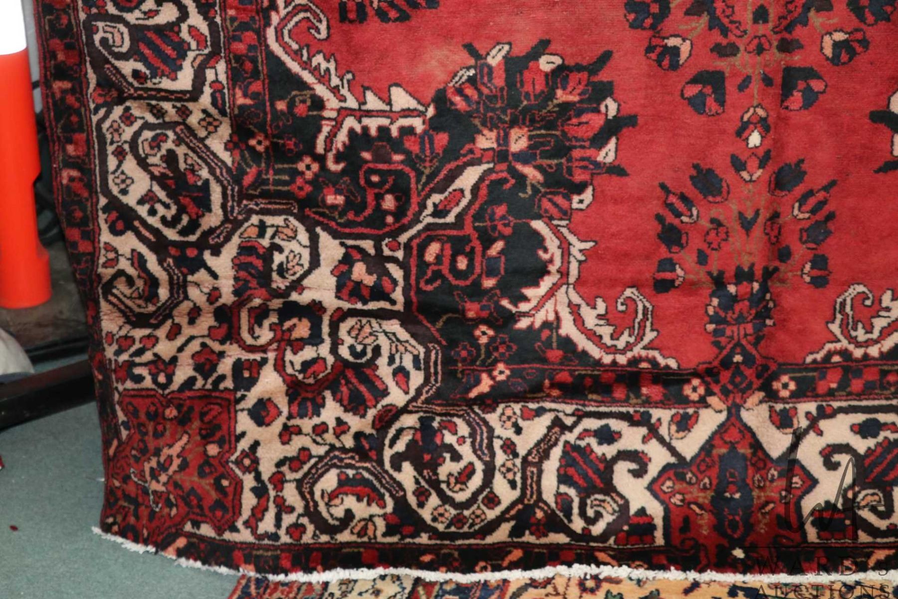 100% hand made Iranian wool carpet, Hamdan, center medallion red background and highlights of black, cream etc. 80" x 114". Note: Not available for shipping. Local pickup only