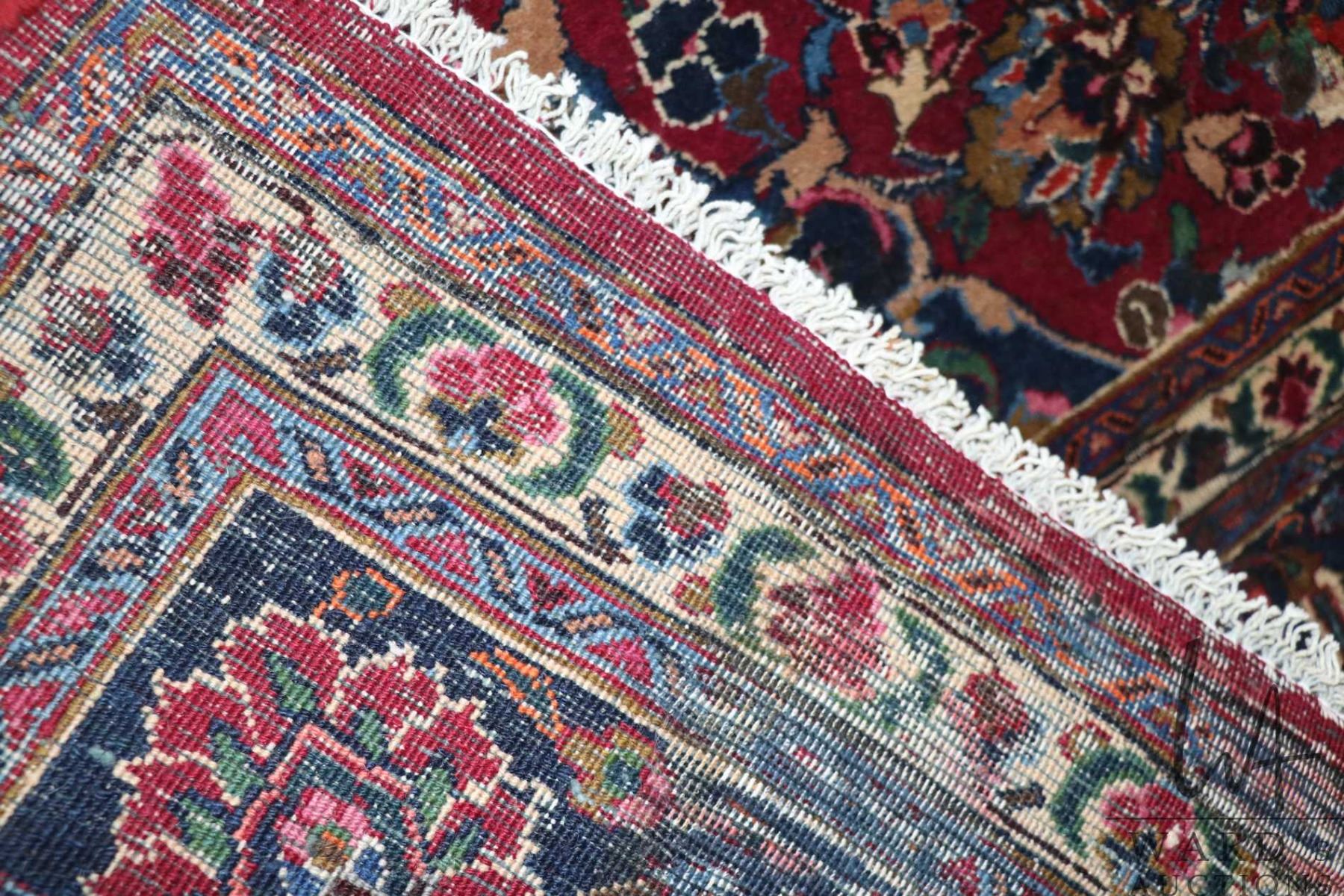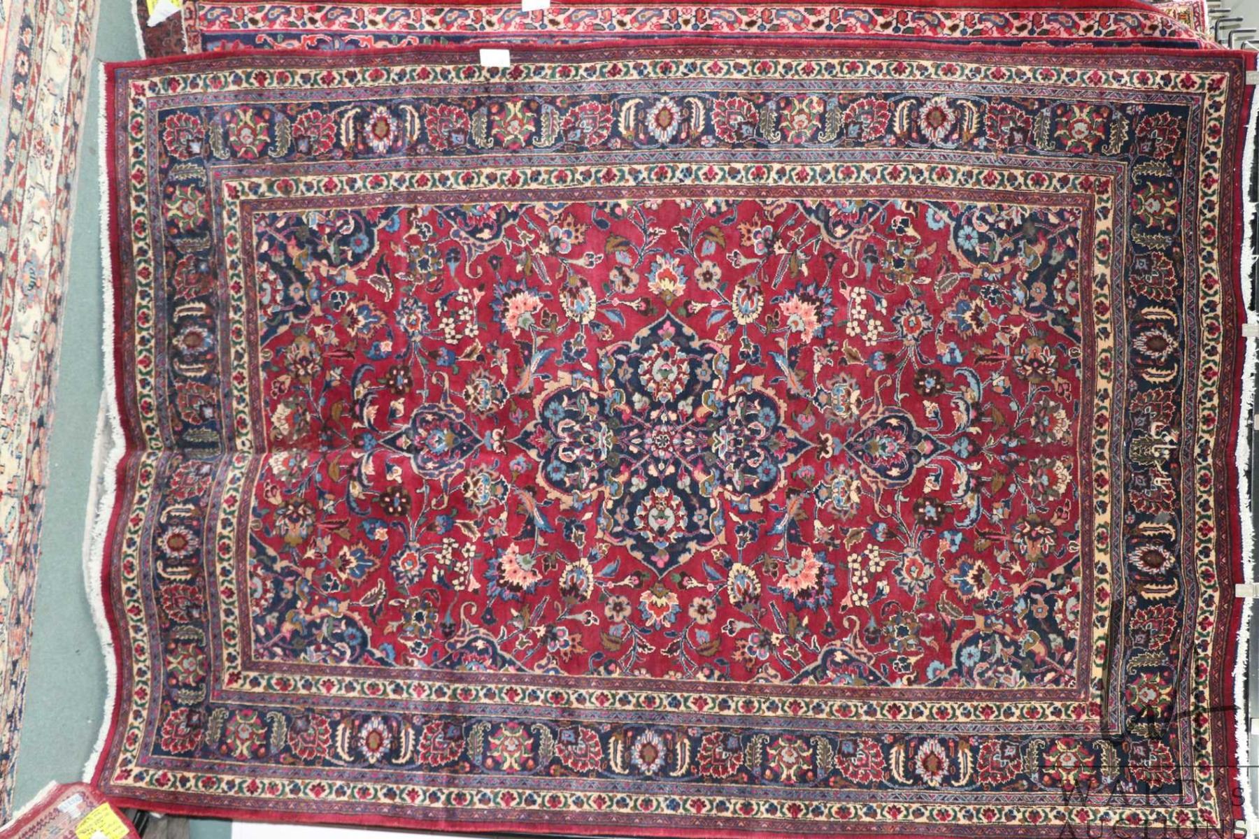 100% hand made Iranian wool carpet, Mashad, center medallion and red background with highlights of c