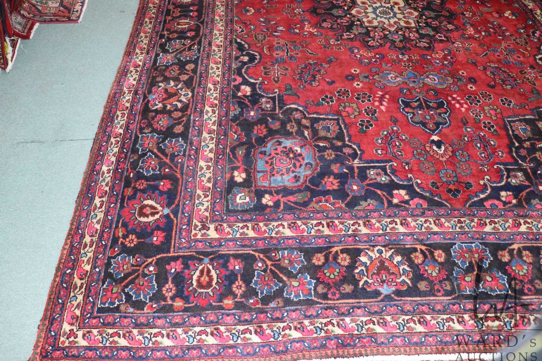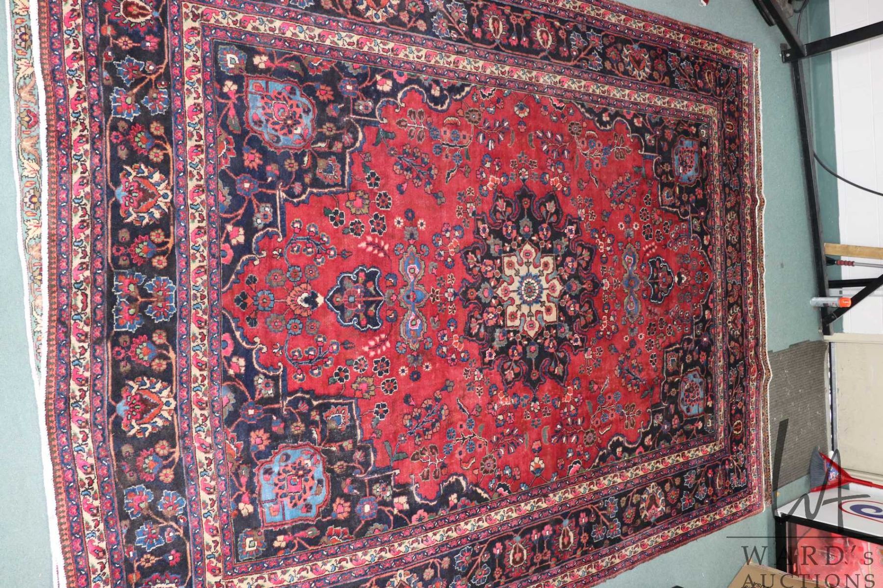 100% hand made Iranian wool carpet, Mashad, center medallion red background and highlights blues, pink, black etc. 119" x 153"