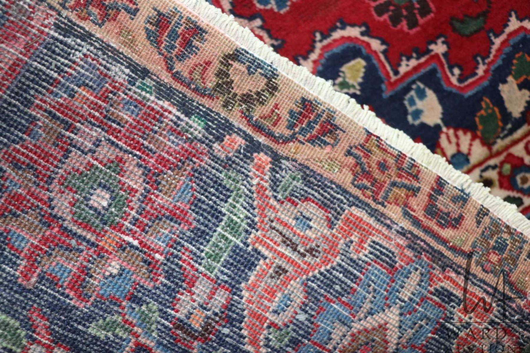100% hand made Iranian wool carpet, Mashad, center medallion, red background and highlights of blue, green, cream etc. 78" x 112". Note: Not available for shipping. Local pickup only