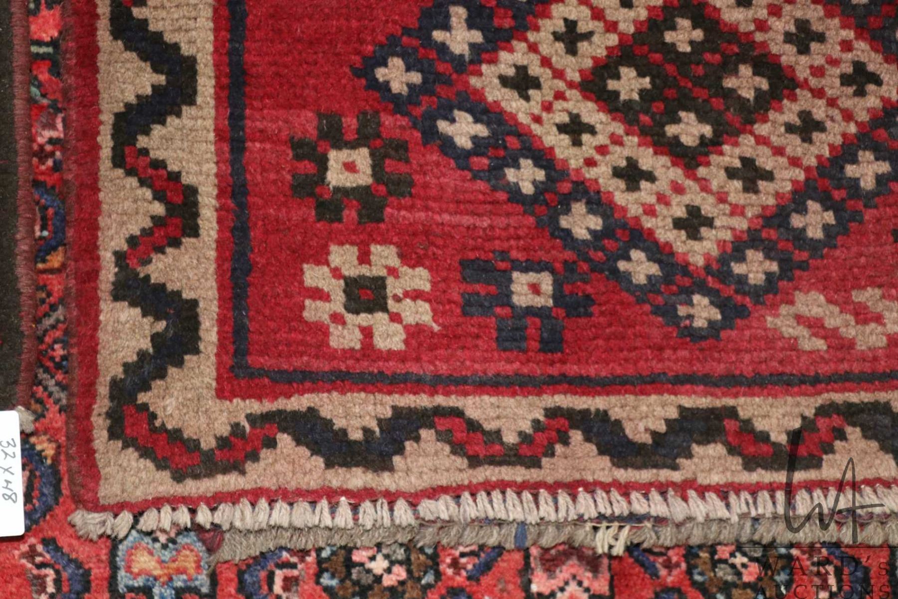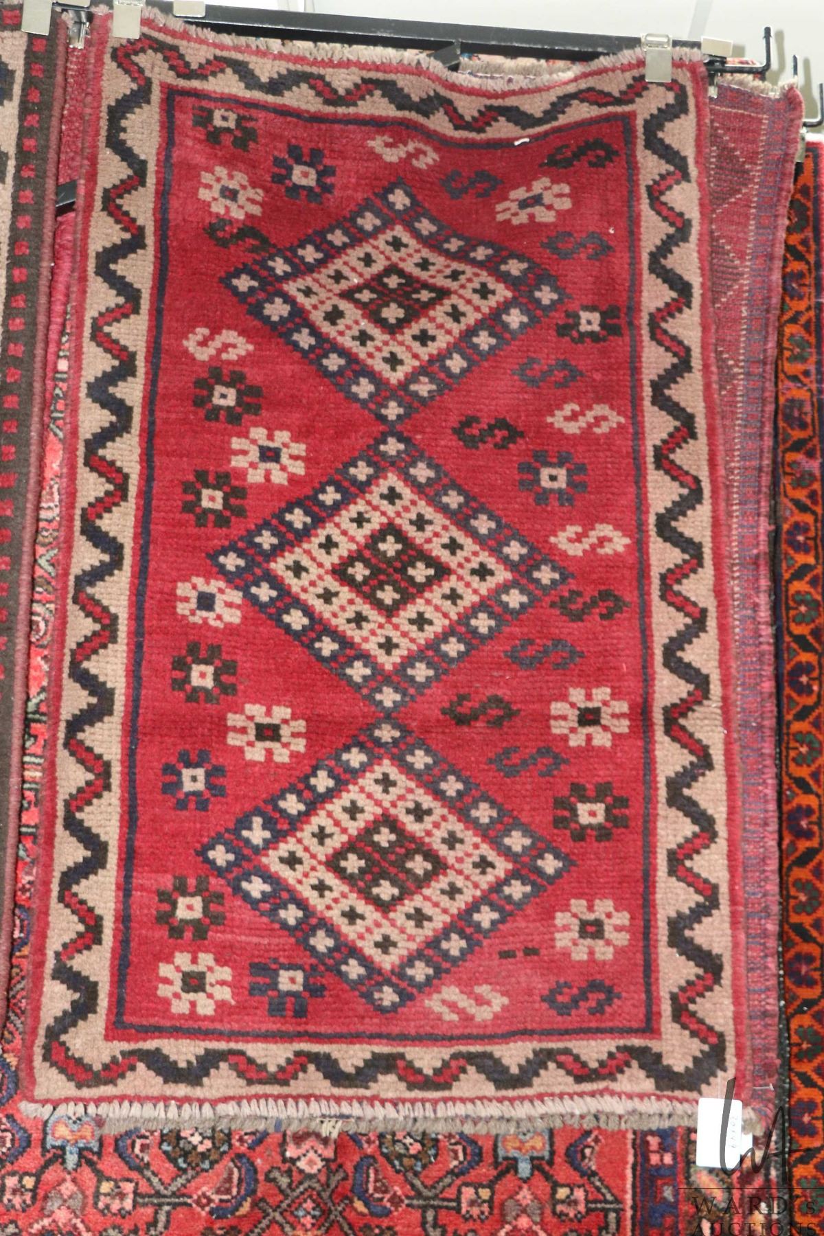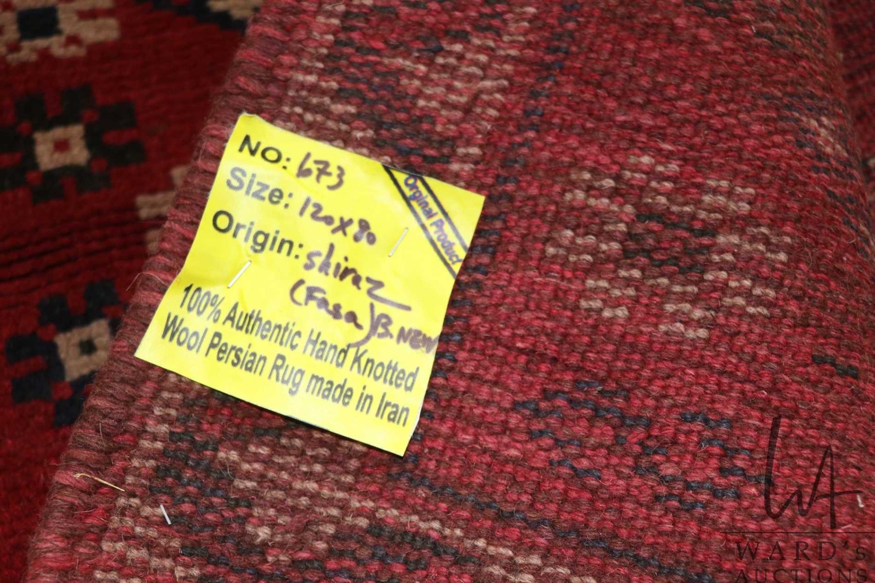 100% hand made Iranian wool carpet, Shiraz, triple medallion, red background and highlights of blue, cream, black etc. 30" x49"