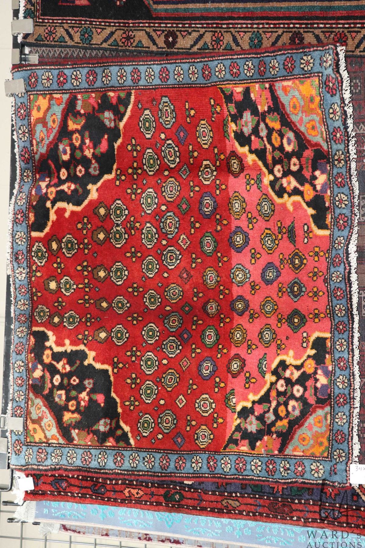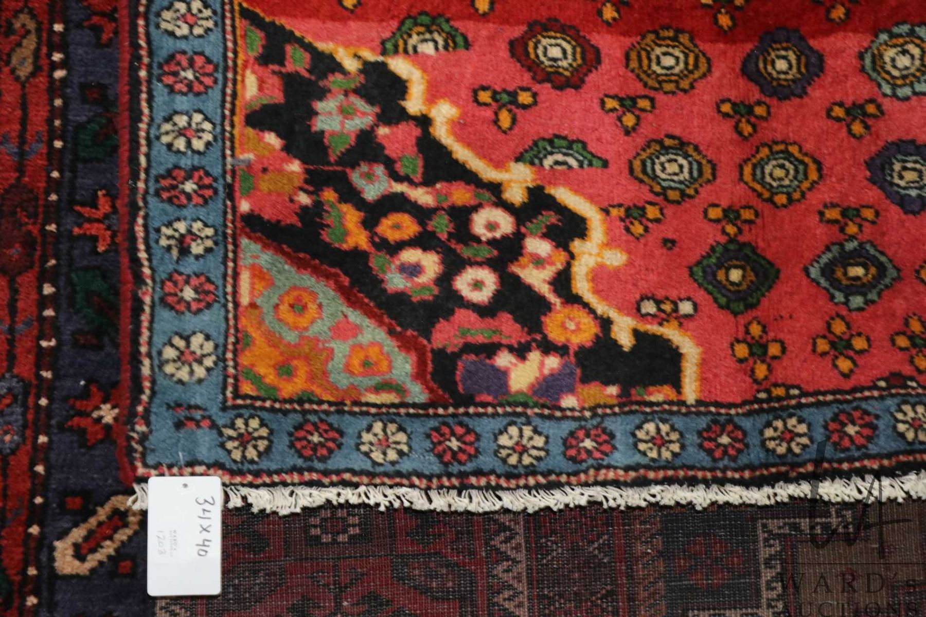 100% hand made Iranian wool carpet "Zanjan" with red background and geometric pattern and highlights of green, blue and pink, 34" X 40"