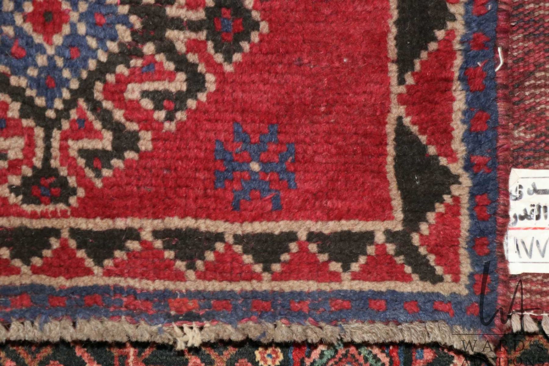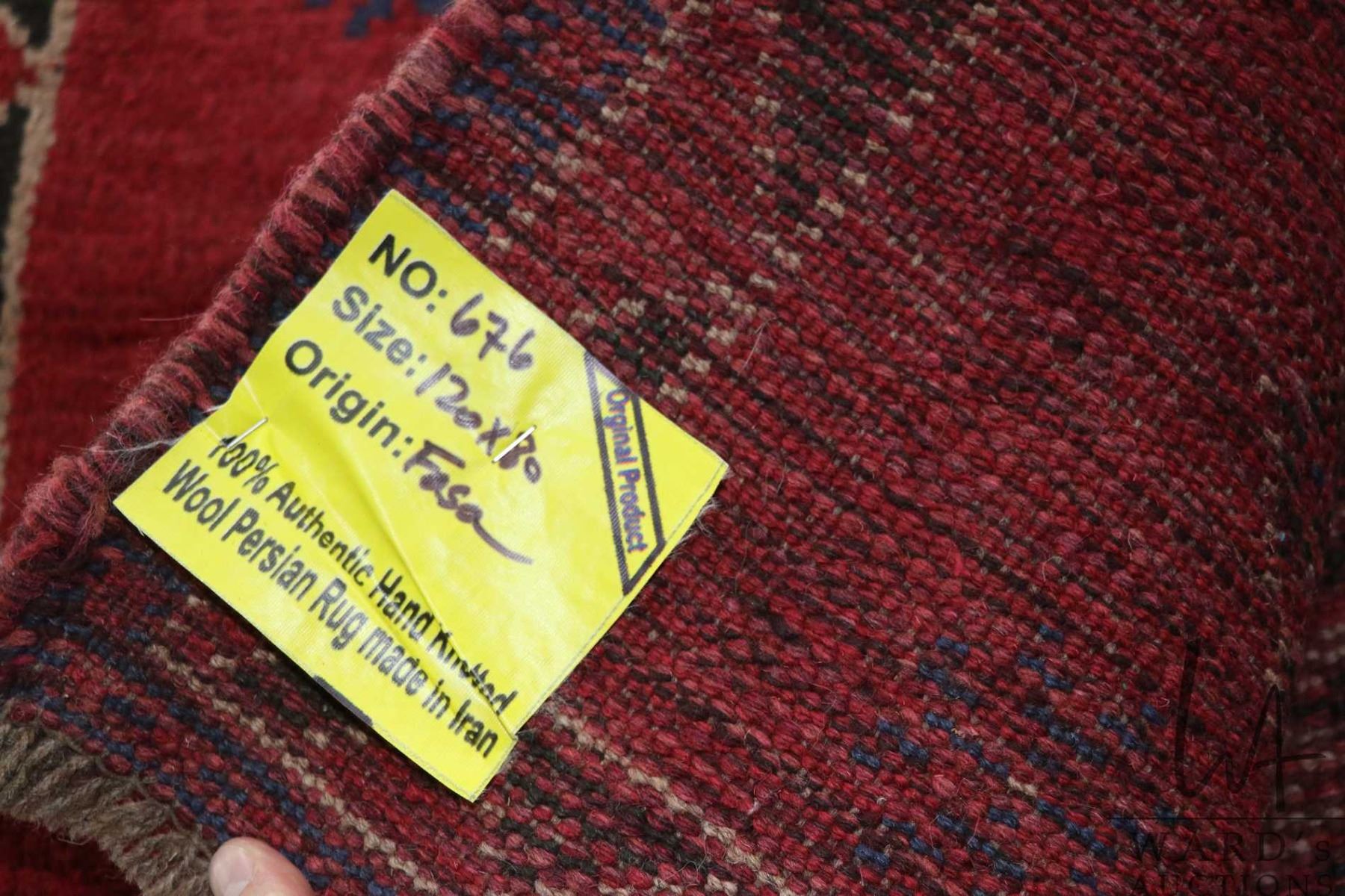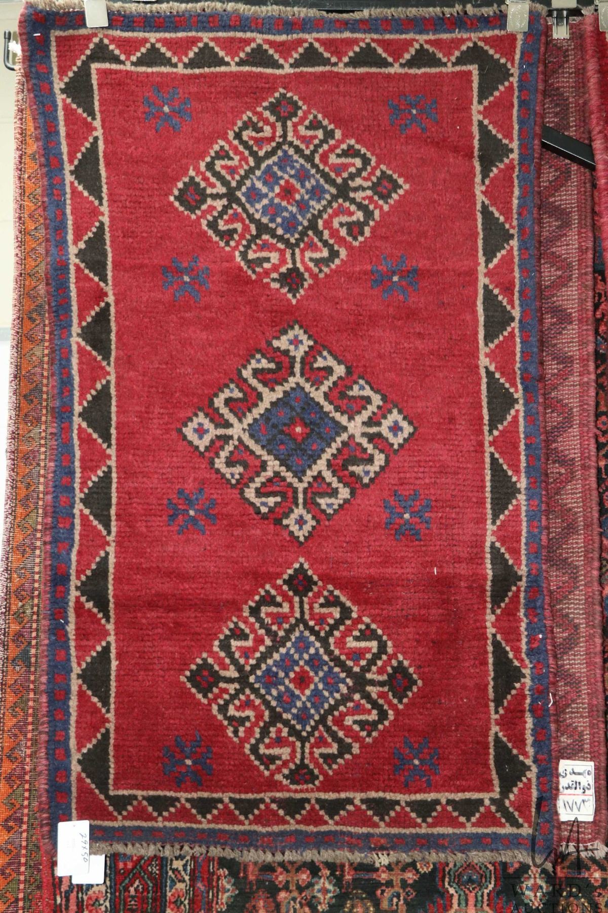 100% hand made Iranian wool carpet, fasa, triple medallion, red background and highlights of blue, black, cream etc. 29" x 50"