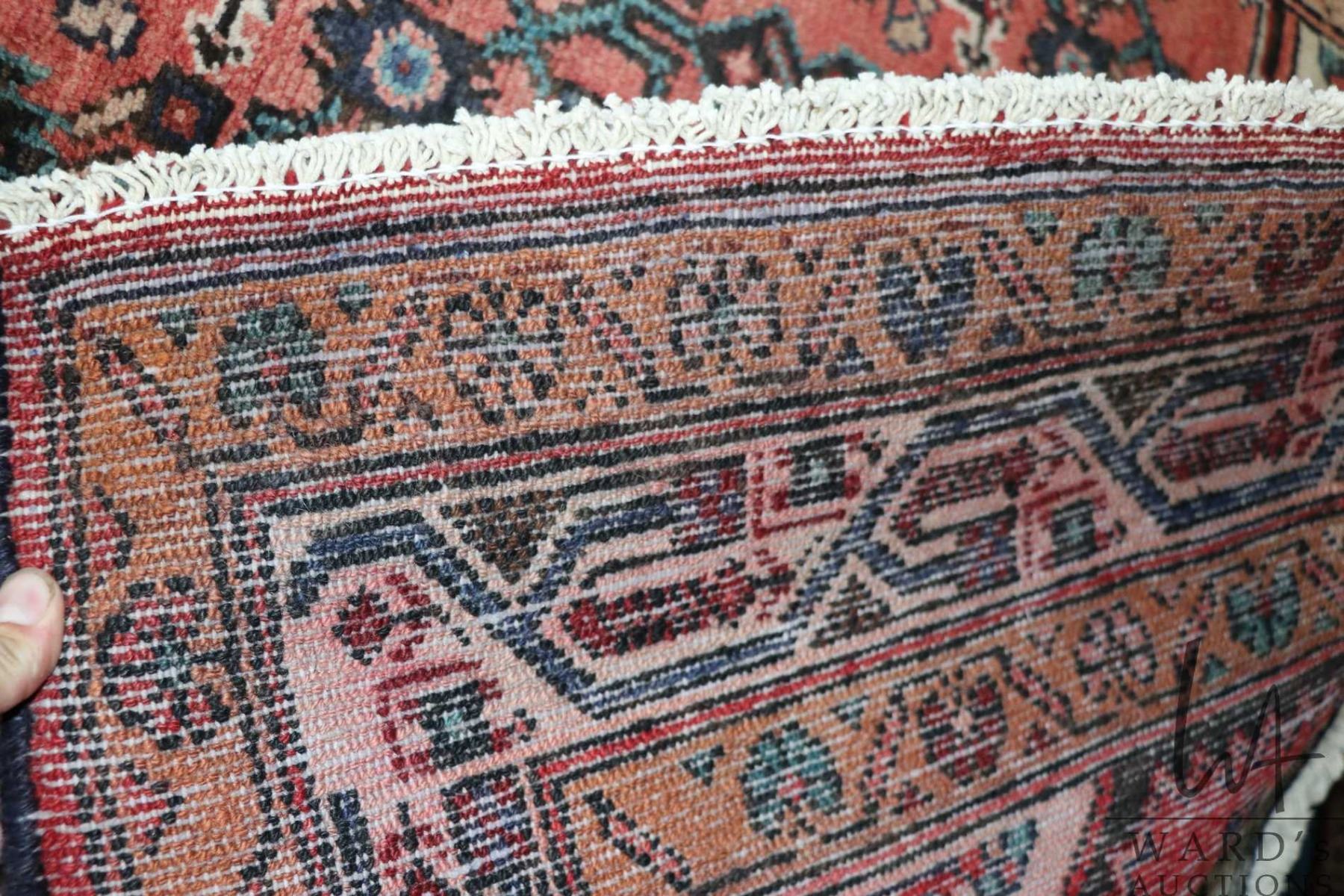 100% hand made Iranian wool carpet runner "Hamdan" with red background, geometric design and highlights of blues, greens, taupe etc. 52" X 115". Note: Not available for shipping. Local pickup only