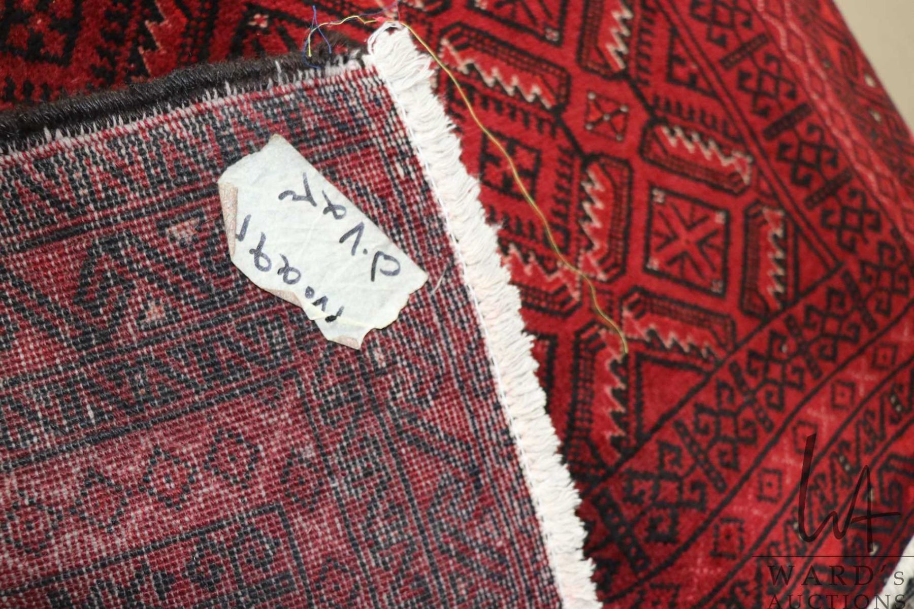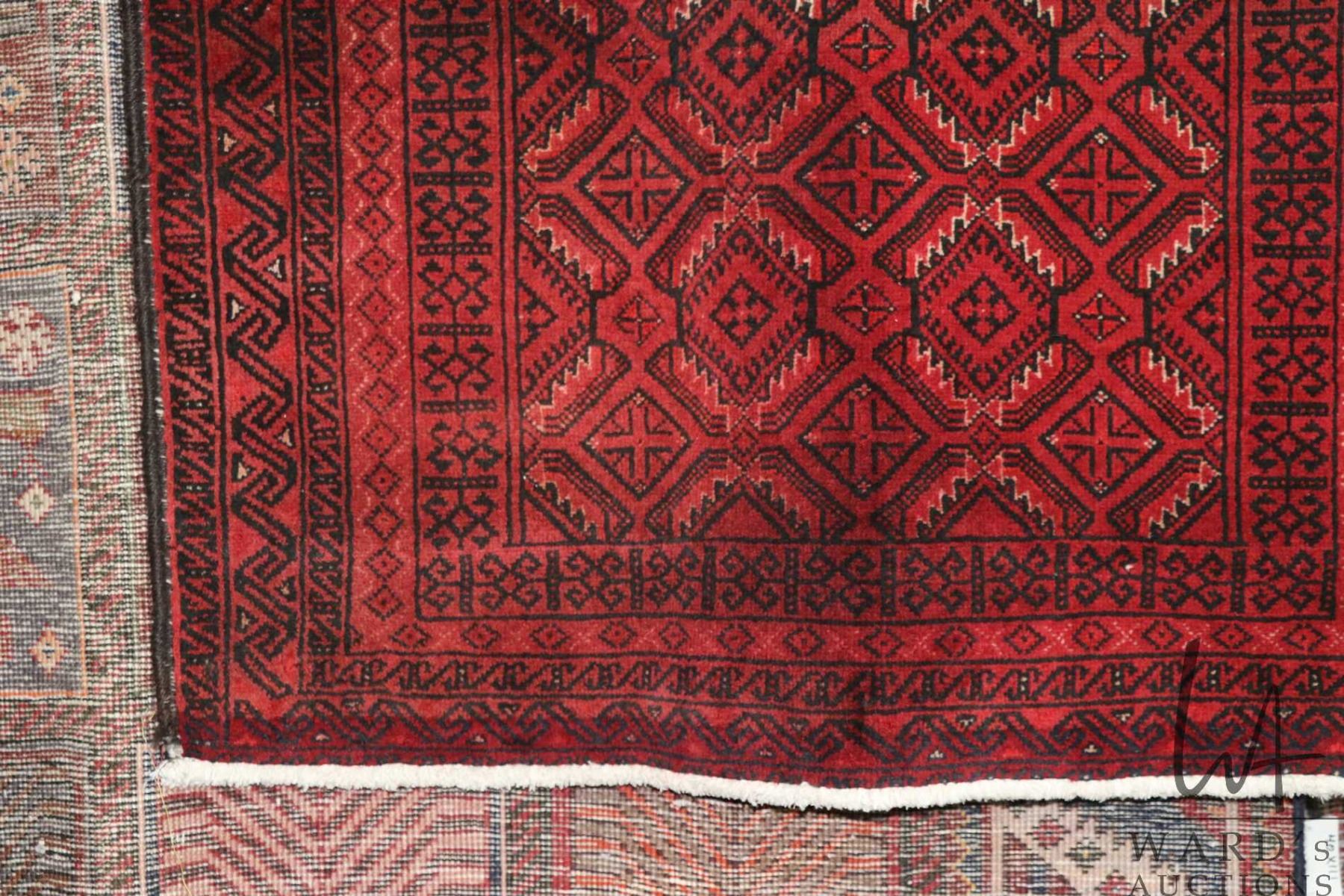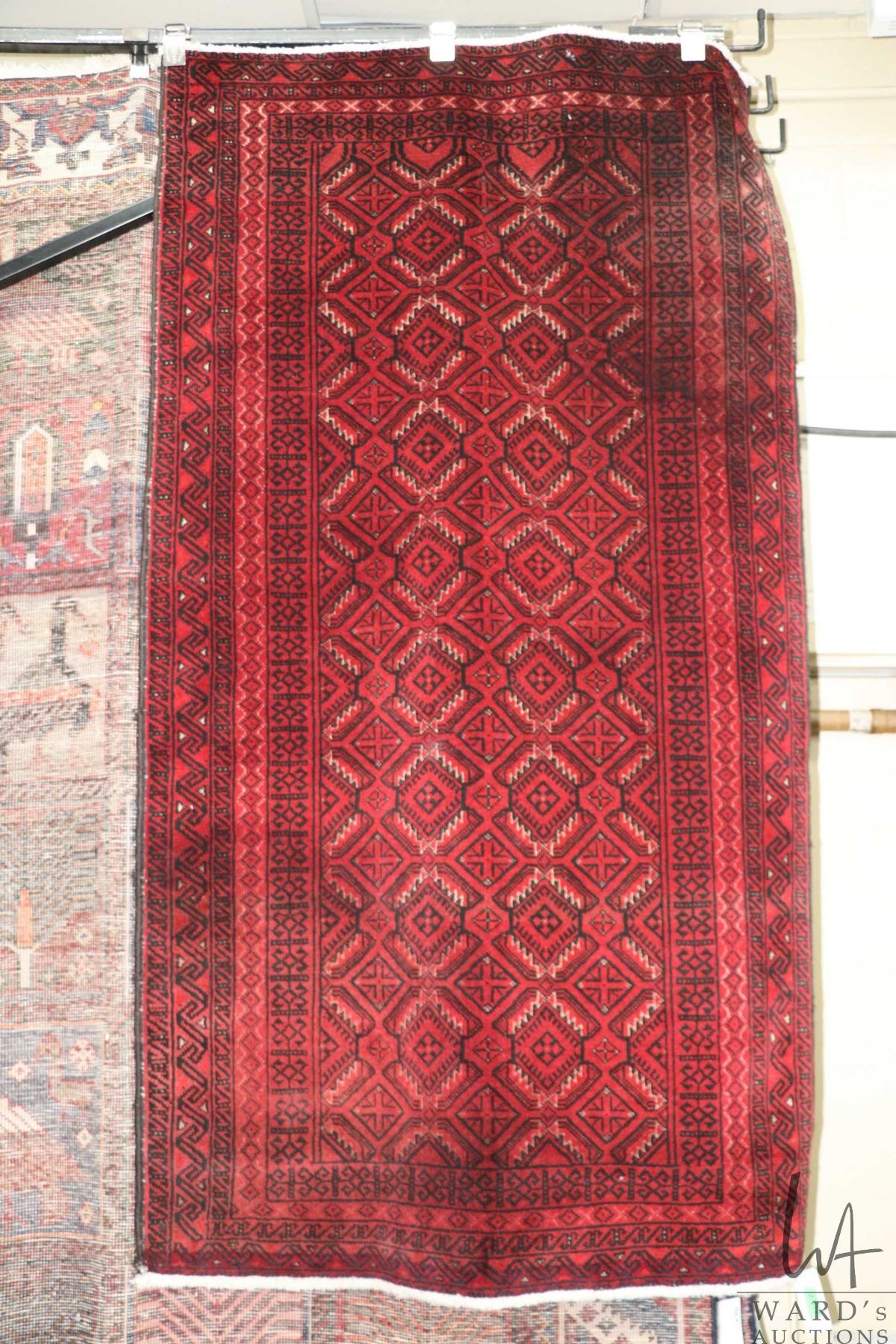 100% hand made Iranian wool scatter carpet "Baluchi" with red background and highlights of black and cream, 36" X 66"