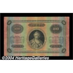 100 rubles 1884, Pick-A53. Very Good-Fine. The rainbow of colors is attractive on this lovely, oversized uncancelled 100 rubles note. There are a few small internal tears and a tiny center hole. Despite seven notes of this elegant type in the sale, do not consider these notes common, the complete opposite is true. Important notice: Heritage usually auctions material at the rate of 200-250 lots per hour. On some occasions eBay Live bid software or the Internet may not be able to keep up with the pace of the auction. We recommend placing a realistic absentee bid now as insurance to avoid disappointment. Occasionally the auctioneer may eliminate or reject an eBay Live bid, and the auctioneer may also reopen a lot after the close of the eBay live bidding (usually because we missed an audience bid), and may reject your bid even if it shows you as the winning bidder. By bidding via eBay Live, you agree that Heritage may award the lot to another bidder at its sole discretion under the circumstances described above or any other reasonable circumstances. Also please note that all Heritage lots purchased through eBay Live carry a 20% Buyer's Premium. Please make sure you read the Terms and Conditions before you bid.