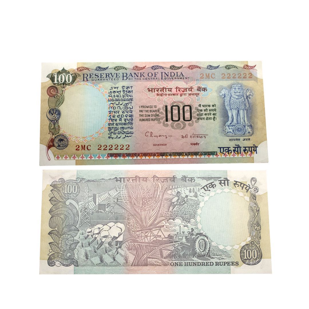 100 rupees, fancy number note, Agriculture series, ND, signed by C. Rangarajan, without inset, serial no.: 2MC 222222 (super fancy), J&R 6.7.10.5A. About Extremely fine, Very scarce.