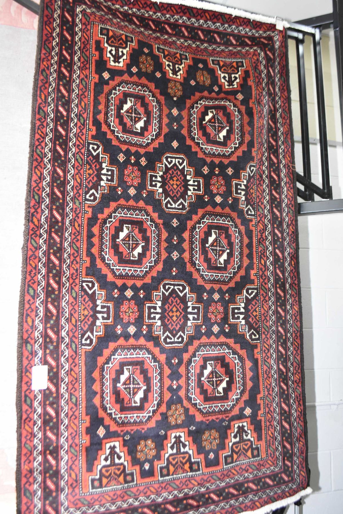 100% wool area rug with geometric design with multiple borders, in shades of royal blue, red and cream, 42" X 80"