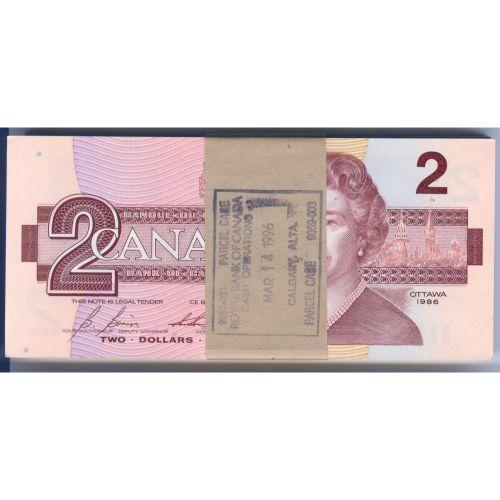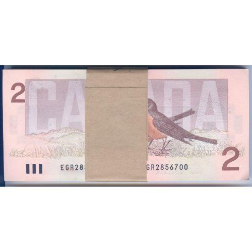 Bank of Canada, 100 x $2.00 Changeovers notes 1986, grade Gem UNC, Charlton # BC-55c-i, signature Bonin Thiessen, serial EGR2856700 to EGR2856799. Problem free notes except the first few on top and bottom that usually have small corner fold.