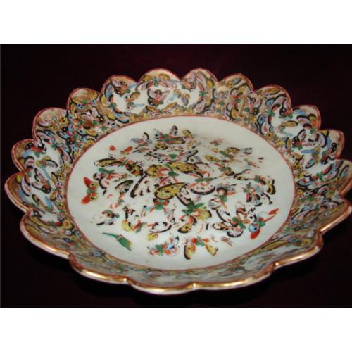 Circa 1850 Chinese Export 1000 Black Butterfly Large Scalloped Bowl with saw tooth edges. This Very Rare form measures 10" in diameter. Excellent Condition with the exception of significant wear to the enamel in the center of the bowl. We also acquired out of the same estate a terrapin bon bon dish in the same pattern.