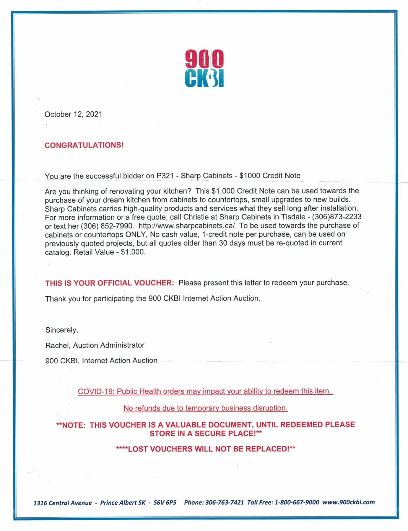 $1000 Credit note for Sharp Cabinets No cash value 1 credit note per purchase (P321)