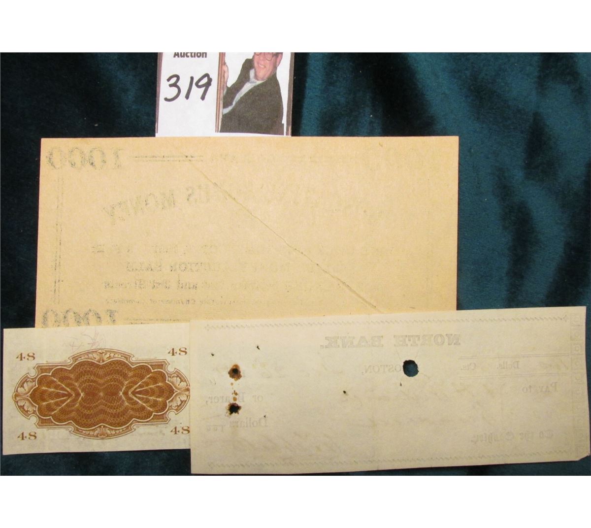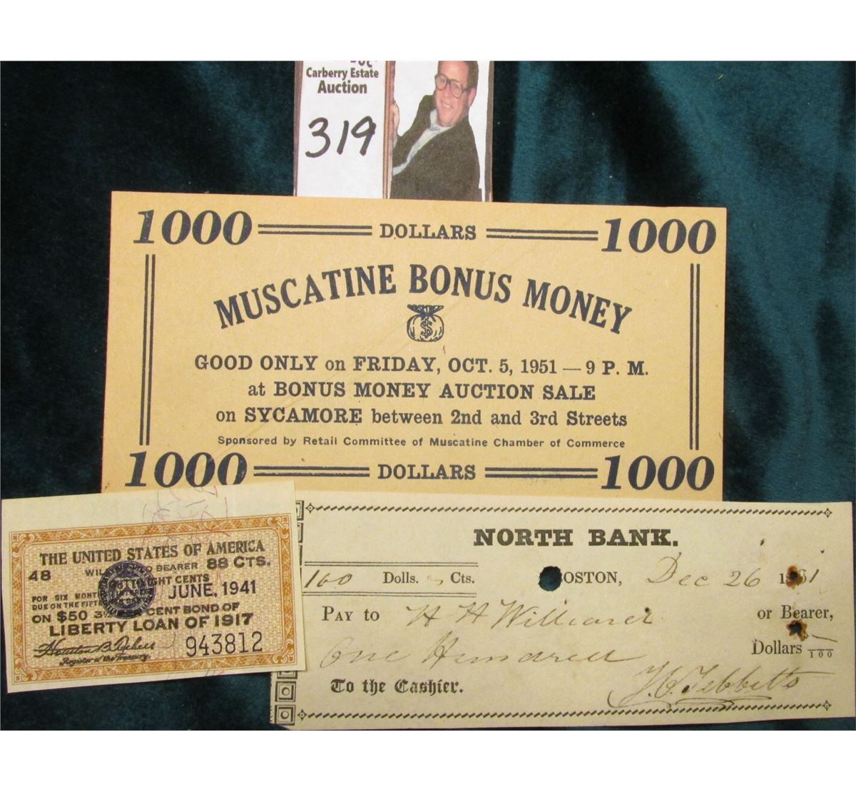 1000 Dollars 1000 Muscatine Bonus Money Good Only on Friday, Oct. 5, 1951…Sponsored by Retail Committee of Muscatine Chamber of Commerce"; "The United States of America…June, 1941…Liberty Loan of 1917"; & Dec 26, 1831 North Bank. Boston," Scrip.