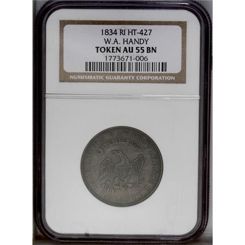 <B>1834 W.A. Handy, Low-78, HT-427, R.1, Providence, RI, AU55 NGC.</B></I> Pristine, olive-brown surfaces show just a trace of highpoint rub. An appealing, lightly circulated example. The Rulau fourth edition shows a value of $250 in MS60.<BR><I>From The Troy Wiseman Collection.</B></I>