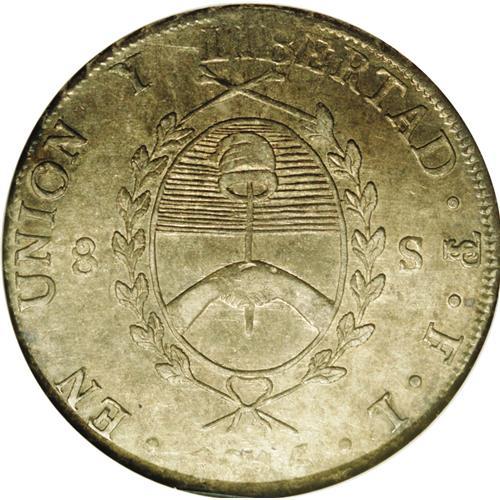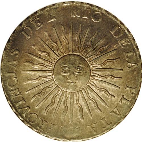 <B>Rio de la Plata. 8 Soles 1815FL-PTS, </B></I>KM15, AU58 NGC, choice pewter gray patina over lustrous fields, just a bit weakly struck on the date. A very appealing example which is rarely encountered in this quality. The 1815 Soles system coinage marked the end of the Potosi Mint products for Argentina.<BR><I>From The Rio De La Plata Collection.</B></I> <BR><BR><B>Important