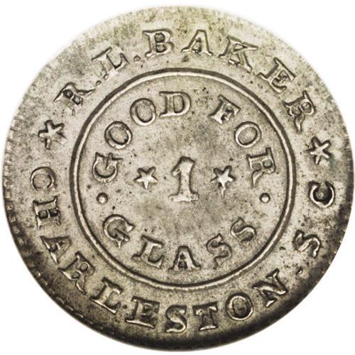 <B>1837 R.L. Baker, Low-108, HT-430, R.7, Charleston, SC, MS61 NGC.</B></I> Ex: John J. Ford Collection. German silver, 19mm. South Carolina tokens from the Hard Times era are all rare and elusive. Russ Rulau's <I>Standard Catalog of United States Tokens 1700-1900</B></I> enumerates three types of South Carolina tokens from the era, with rarities ranging from R.7 to R.9. The present example is one of only seven pieces "in public hands," according to Rulau. This type of trade token was "Good For 1 Glass" of soda water at the R.L. Baker establishment in Charleston. The obverse, curiously, shows a steaming urn of liquid, mounted on a pedestal, with a star on the side of the urn. The piece is boldly struck, with light-gray surfaces that are free of any mentionable distractions, and assured ranks high in the Condition Census of the finest known pieces. An AU specimen of the HT-430 fetched $3,630 in a 1989 Gil Steinberg sale, and in 2000 a VF example traded hands in the PCAC sale (10/00, lot 38) at $4,620. The Rulau fourth edition (page 195) provides a value in AU of $6,250, with no prices given for Uncirculated. For aficionados of Southern Hard Times-era pieces, this opportunity must not be missed.<BR><I>From The Troy Wiseman Collection.</B></I><BR><I>Ex: John J. Ford Collection sale, Part IV (Stack's, 6/04), lot 190.</B></I>