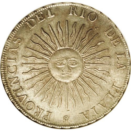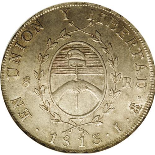 <B>Rio de la Plata. 8 Reales 1813J-PTS, </B></I>KM5, MS62 NGC, lightly toned over fully lustrous and completely original surfaces, a coin with incredible eye appeal. Very rare in this lofty quality!<BR><I>From The Rio De La Plata Collection.</B></I> <BR><BR><B>Important