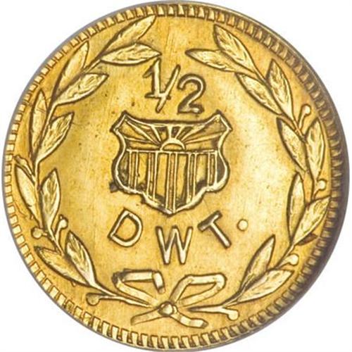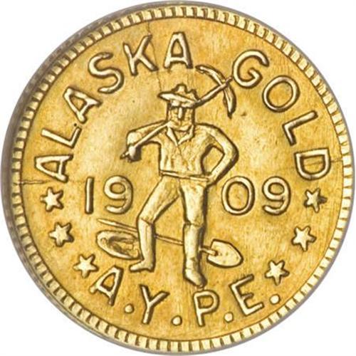<B>1909 Alaska AYPE 1/2 DWT MS62 NGC.</B></I> Gold. From the Hart's Coins of the West series, sold at the 1909 Alaska-Yukon-Pacific Exhibition. The last A in ALASKA is over the miner's hat, and the reverse appears to have eight berries. <BR> <BR><BR><b>Shipping:</b> Coins & Currency (<a target="_blank" href="http://www.heritageauctions.com/common/shipping.php">view shipping information</a>)
