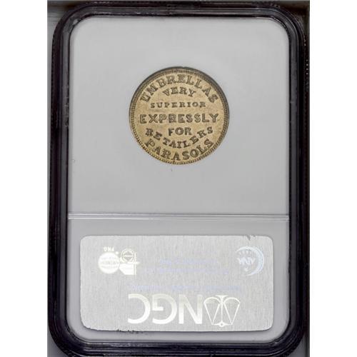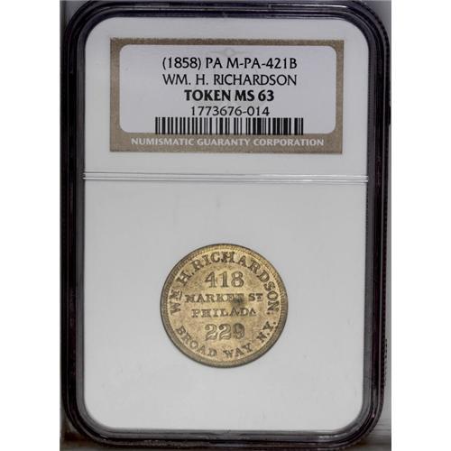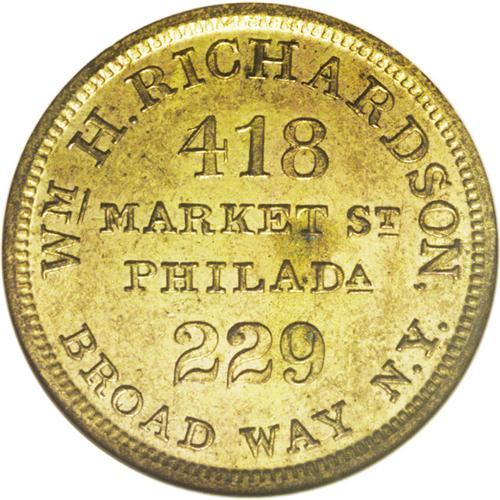 <B>(1858) Wm. H. Richardson, M-Pa-421B, Philadelphia, PA, MS63 NGC.</B></I> Brass, 24mm. A second address has been added on this piece, 229 Broadway, New York. Brownish-gold surfaces with a bit of soiling. Rulau values it in the fourth edition (page 393) at $35 in Unc.<BR><I>From The Troy Wiseman Collection.</B></I>