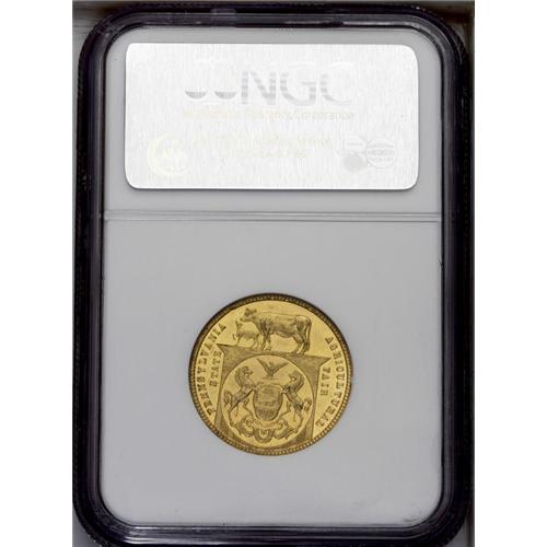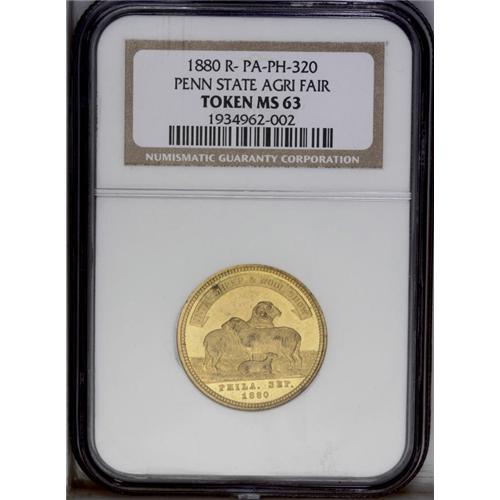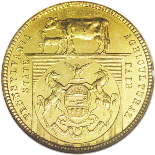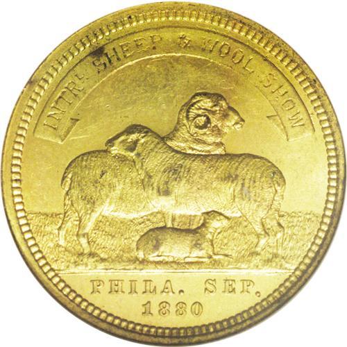 <B>(1880) Pennsylvania State Agricultural Fair, Pa-Ph-320, Philadelphia, PA, MS63 NGC.</B></I> Gilt bronze, 25.3mm. A pleasing problem-free yellow-gold example with considerable cameo contrast, picturing various agricultural species. The Rulau fourth edition prices the piece at $60 in MS60.<BR><I>From The Troy Wiseman Collection.</B></I>