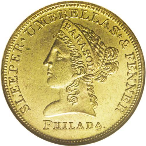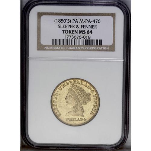 <B>(1850s) Sleeper & Fenner, M-Pa-476, Philadelphia, PA, MS64 NGC.</B></I> Brass, 28mm. The Sleeper and Fenner tokens mimic the gold Liberty Head designs of the era. In this instance the Liberty figure has PARASOL on her coronet. The surfaces are a pretty brass-gold, with no visible impairments. The Rulau reference, fourth edition, values the piece at $40 in MS60. This lovely near-Gem piece should bring much more.<BR><I>From The Troy Wiseman Collection.</B></I>