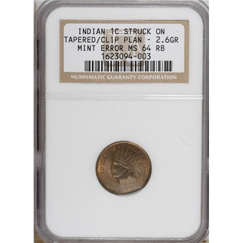 <B>No Date MS Indian Cent--Struck on Tapered/Clip Planchet--2.6 Grams MS64RB NGC.</B></I><BR><BR><b>Shipping:</b> Coins & Currency (<a target="_blank" href="http://www.heritageauctions.com/common/shipping.php">view shipping information</a>)