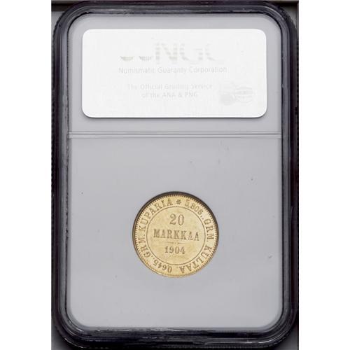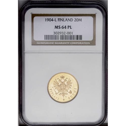 <B>Russian Duchy gold 20 Markkaa 1904-L,</B></I> KM-9.2, MS64 Prooflike NGC. Light contact marks with nicely reflective surfaces. <BR><BR><B>Important